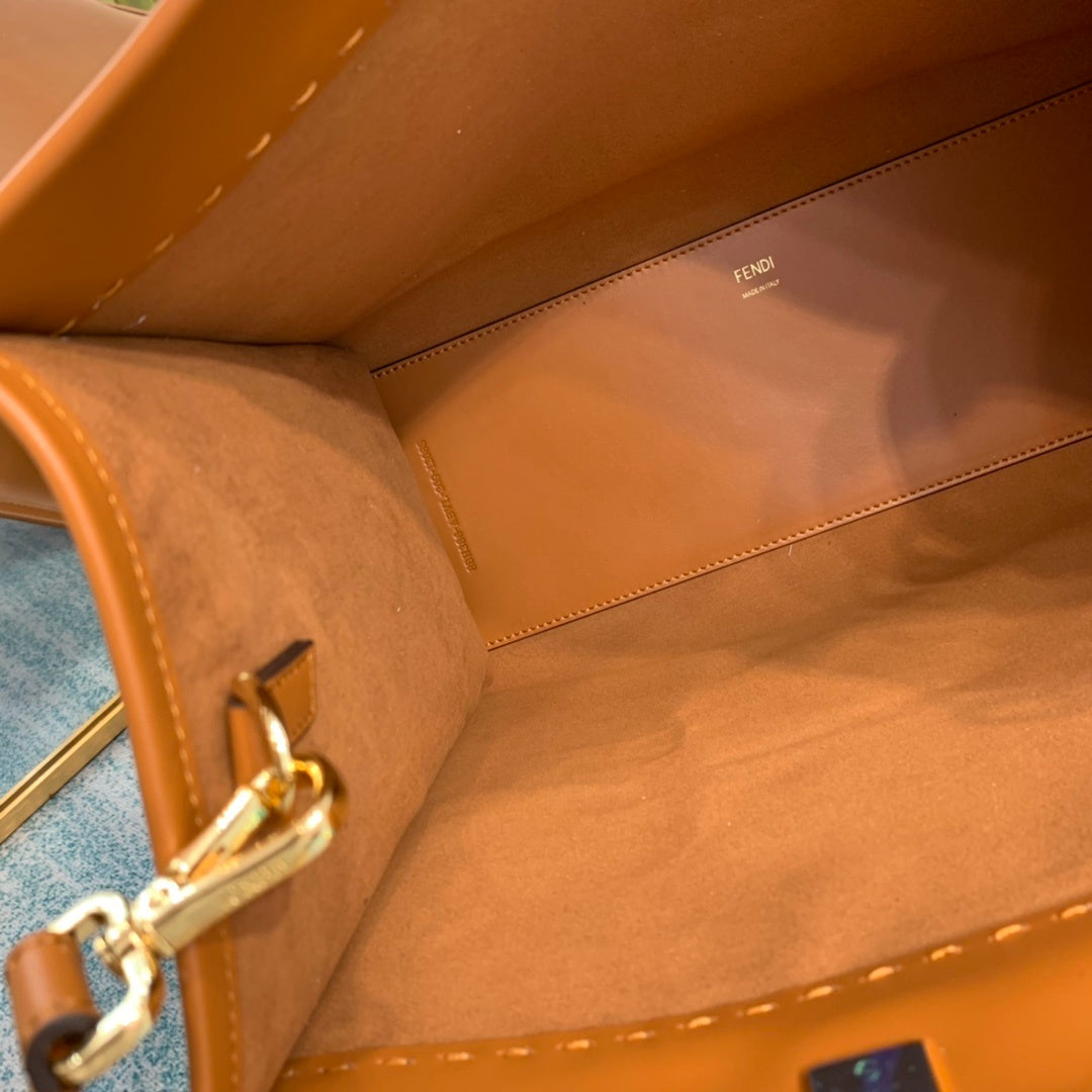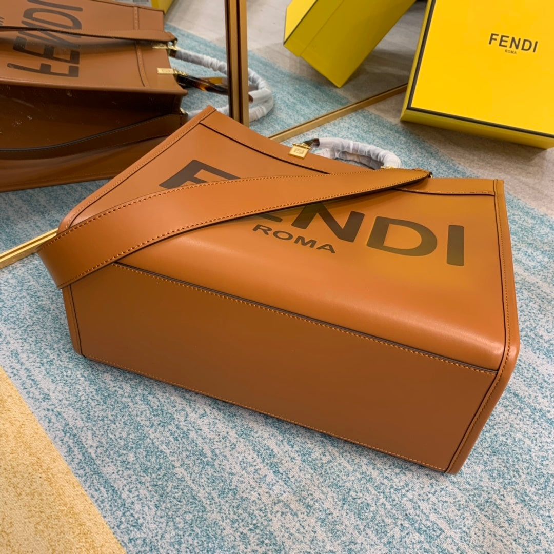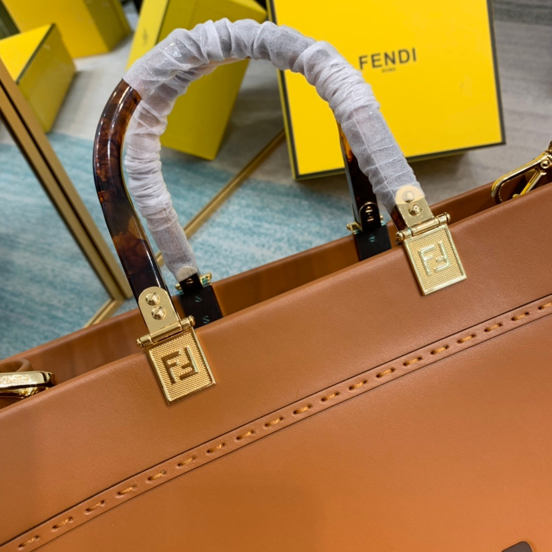 Medium Sunshine Shopper bag made from brown with hot-stamped “FND ROMA” and stiff tortoiseshell plexiglass handles. Can be carried by hand or worn on the shoulder thanks to the two handles and detachable shoulder strap.