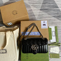 The Gucci Aria collection is an exploration of the House's most emblematic codes and symbols. A member of the Beloved family, the GG Marmont is synonymous with its matelassé leather and monogram hardware. Here, the small shoulder bag is reimagined with a new geometric take on its signature finish that combines vertical and diagonal motifs.