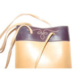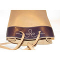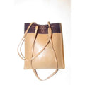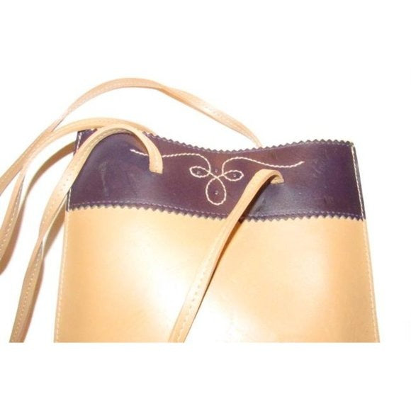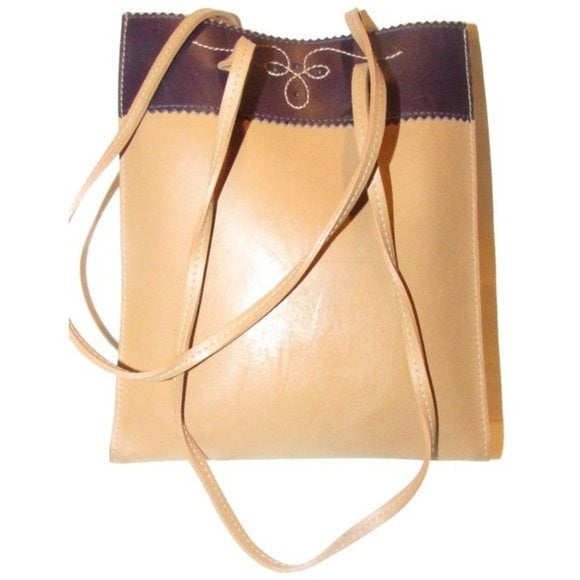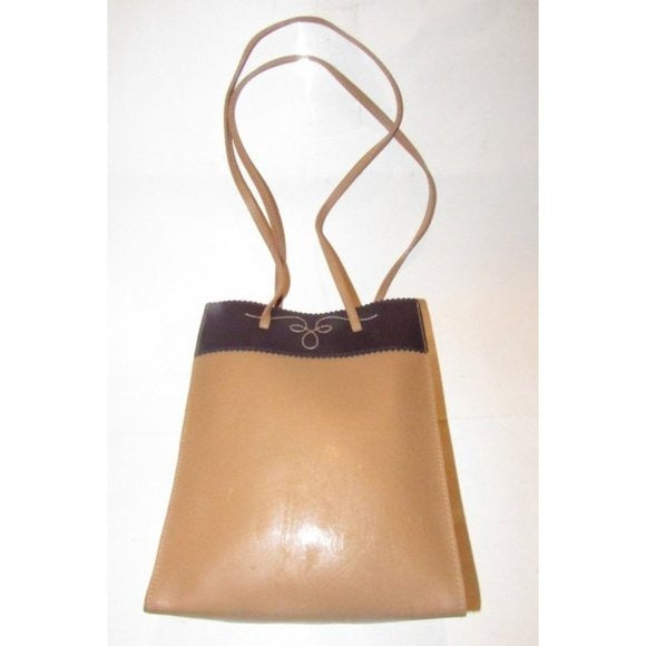 The purse is a petite tote or satchel style made of camel leather with a brown leather accent at the top in a color block design! At the top in the center, it has a cut out design with a stitched accent. It has two longer straps.
