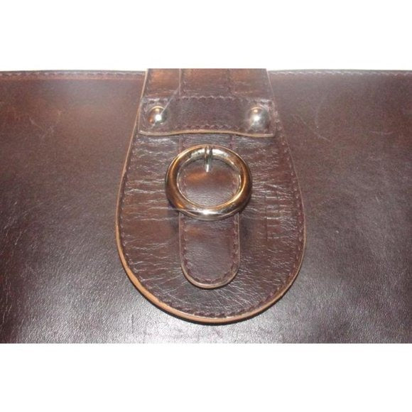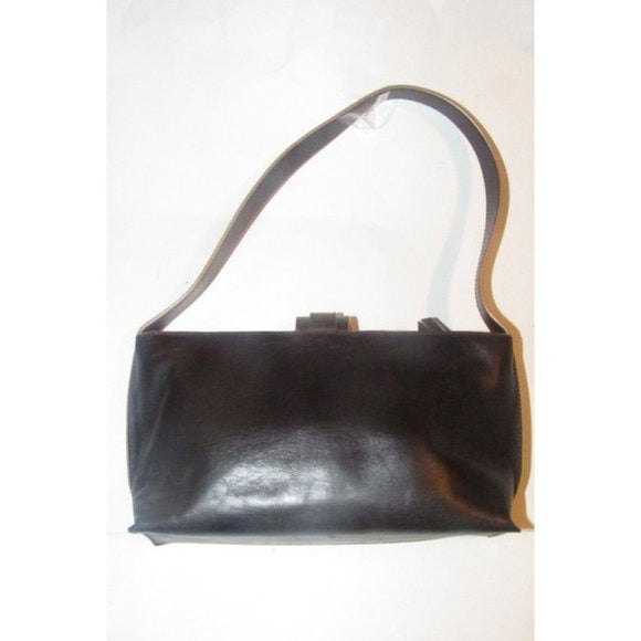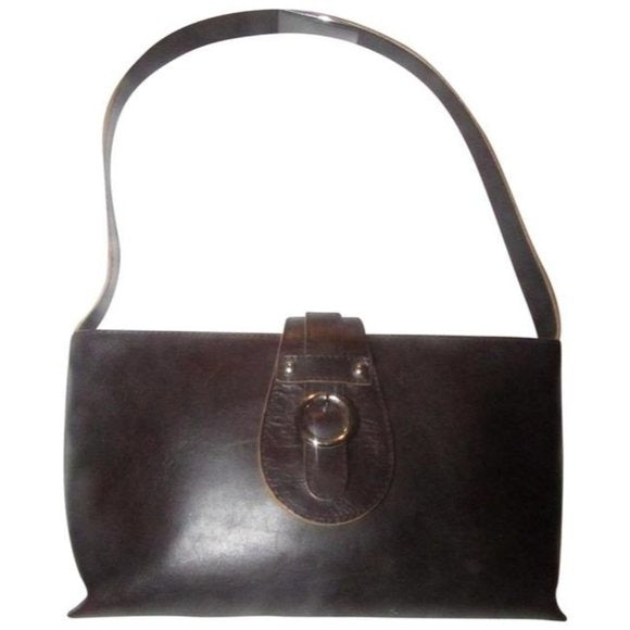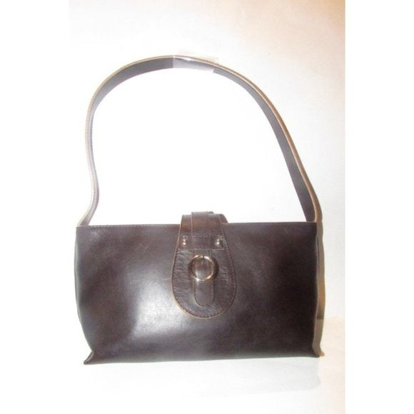 It is a perfect brown purse for anytime of year with a chic Italian style! The purse is a gorgeous, rich brown leather with camel piping. It has a decorative leather strap that hangs over the zip top closure with a bold chrome, equestrian accent.