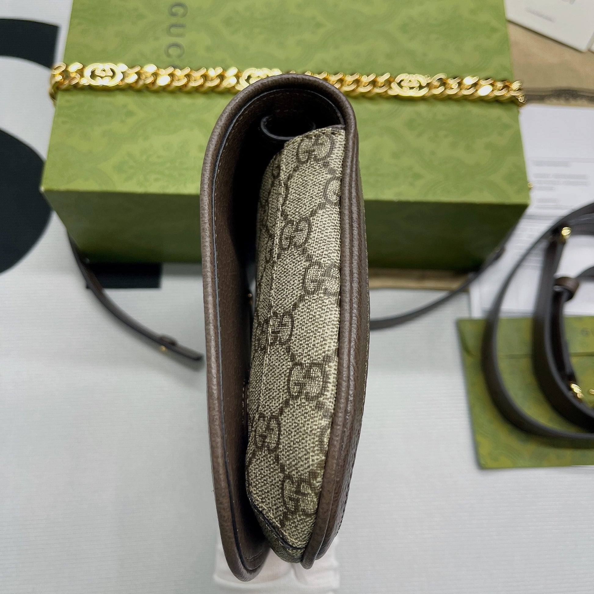 Vintage elements are paired with archival details as an ode to the glamour that permeated the GG Love Parade fashion show. This shoulder bag pairs a delicate chain strap with GG Supreme canvas to infuse the accessory with a timeless feel. Reintroduced in honour of the collection, the rounded silhouette is completed by a historical, rounded iteration of GGo GG’s monogram.
