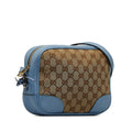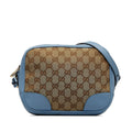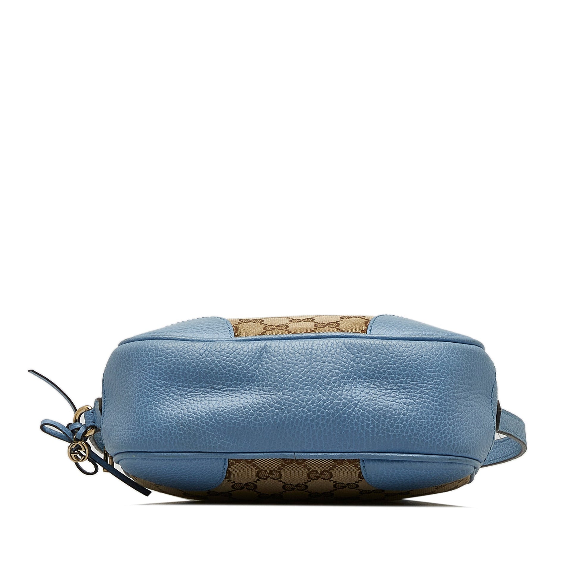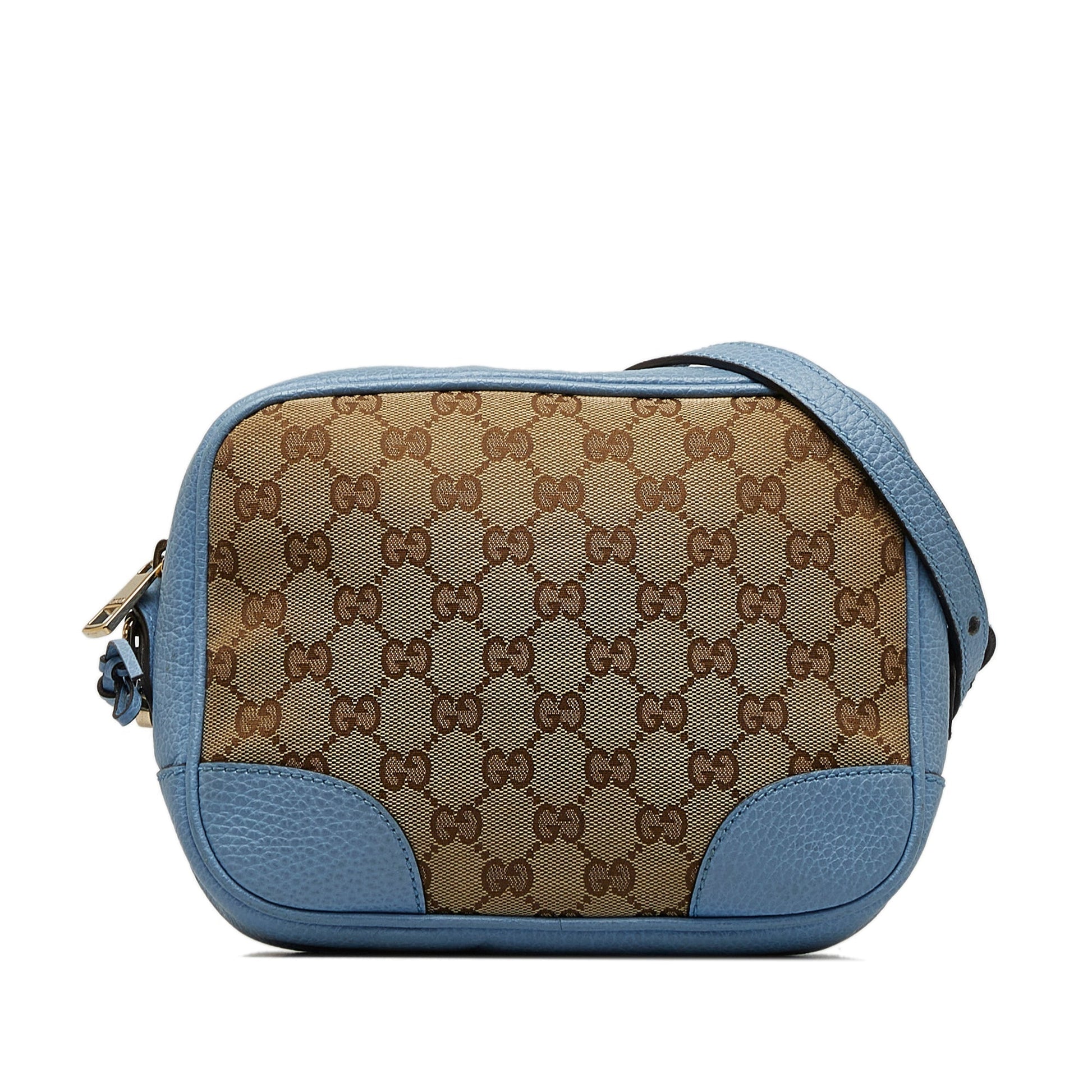 This Bree crossbody bag from Gucci is made from light brown GG canvas. The Bag features blue leather trims, gold-tone details, a flat leather shoulder strap, a zipper at the top opening and zipper and slip pockets on the inside. The Bag can be across the body or loosely over the shoulder.