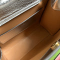 The House prestlmts a whimsical collection of ready-to-wear, shoes and accessories in a colorful palette. As a joyful reinterpretation of GG’s heritage, hearts and rhombus motifs appear alongside floral acctlmts imbuing the sTLMction with a romantic feel that cTLMbrates love. A blue cut-out heart motif defines this small silver GG Diana small tote bag.