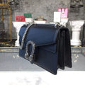The Dionysus shoulder bag with the now defining tiger head closure-a unique detail referencing the Greek god Dionysus, who in myth is said to have crossed the river Tigris on a tiger sent to him by Zeus. The closure is further enhanced with black crystals. The sliding chain strap can be worn multiple ways, changing between a shoulder and a top handle bag. Made in textured, resistant