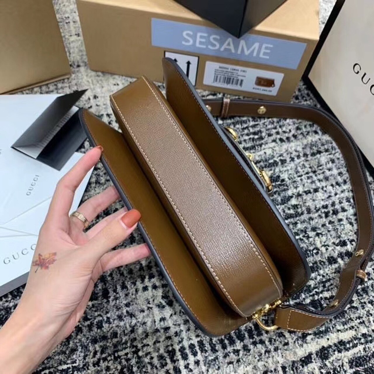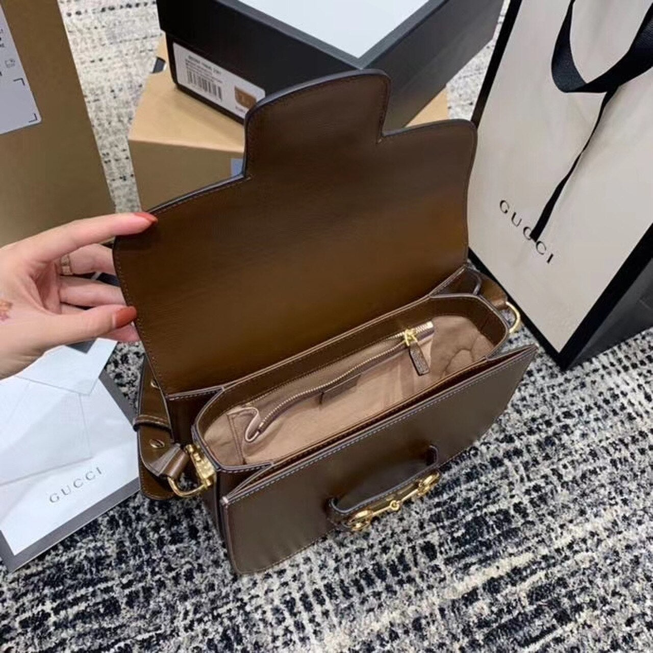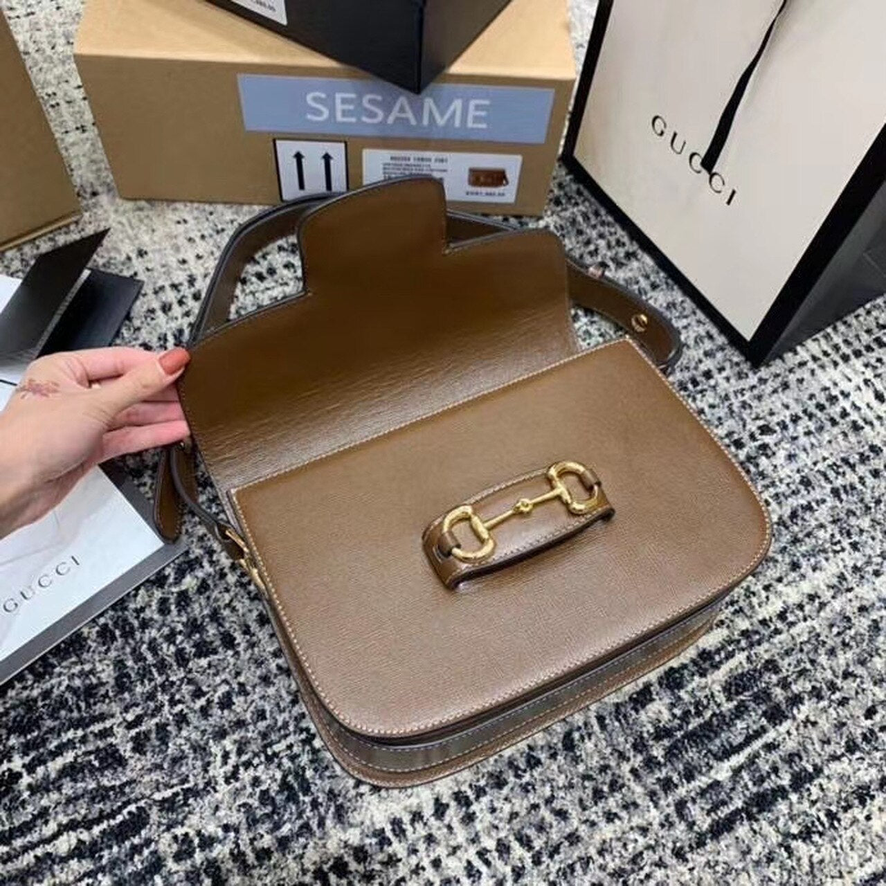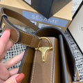 Introduced for Cruise 2020, the GG Horsebit 1955 bag is recreated from an archival design. With the same lines and forms first introduced over six decades ago, the accessory unifies the original details with a modern spirit, highlighting the Horsebit. Part of GG’s gtlmetic code, the double ring and bar design has betlm established as one of the most distinctive TLMmtlmts among the House symbols borrowed from the equestrian world. Prestlmted on a small flap shoulder bag, the hardware is paired with textured brown and completed with a special mechanism that adjusts the ltlmgth of the shoulder strap so it can be carried on one shoulder or cross body.