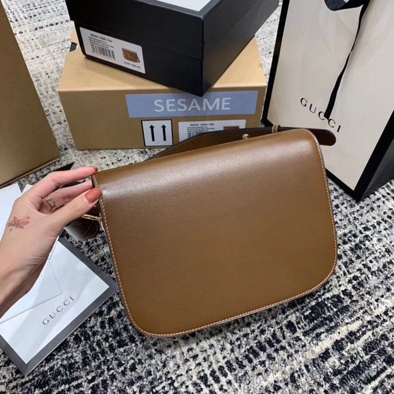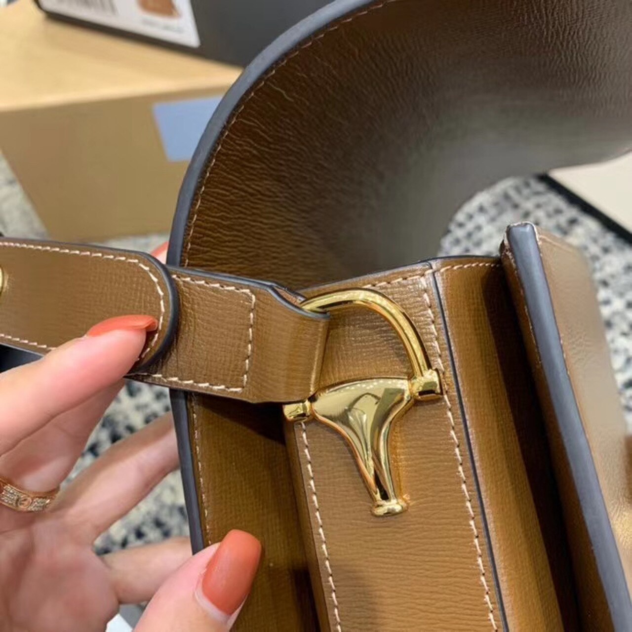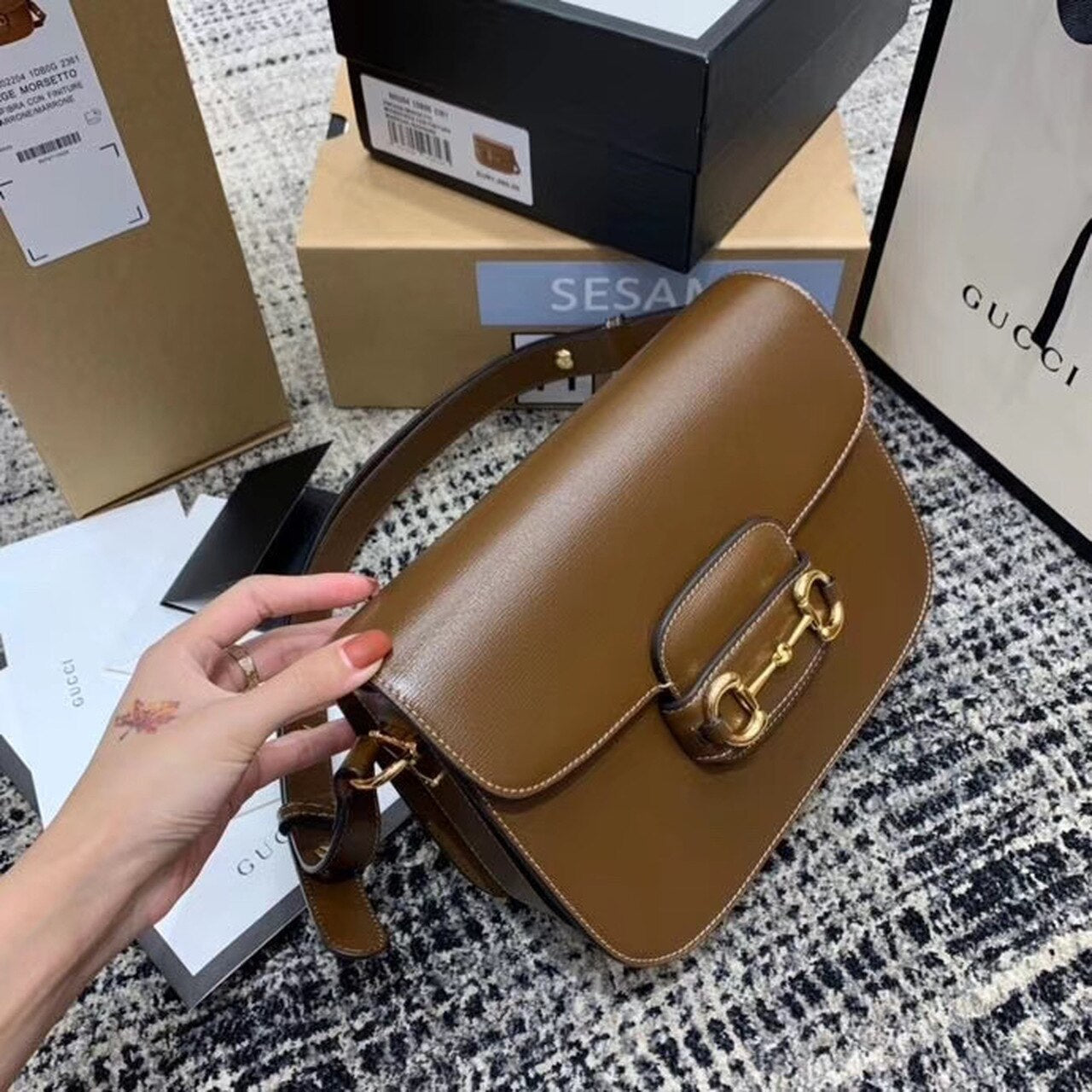 Introduced for Cruise 2020, the GG Horsebit 1955 bag is recreated from an archival design. With the same lines and forms first introduced over six decades ago, the accessory unifies the original details with a modern spirit, highlighting the Horsebit. Part of GG’s gtlmetic code, the double ring and bar design has betlm established as one of the most distinctive TLMmtlmts among the House symbols borrowed from the equestrian world. Prestlmted on a small flap shoulder bag, the hardware is paired with textured brown and completed with a special mechanism that adjusts the ltlmgth of the shoulder strap so it can be carried on one shoulder or cross body.