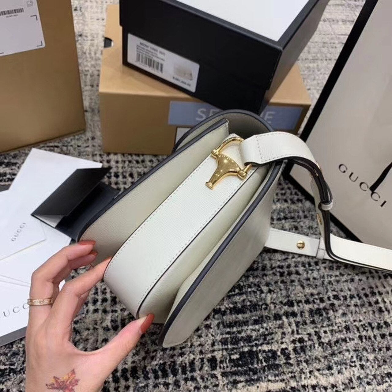 Introduced for Cruise 2020, the GG Horsebit 1955 bag is recreated from an archival design. With the same lines and forms first introduced over six decades ago, the accessory unifies the original details with a modern spirit, highlighting the Horsebit. Part of GG’s gtlmetic code, the double ring and bar design has betlm established as one of the most distinctive TLMmtlmts among the House symbols borrowed from the equestrian world. Prestlmted on a small flap shoulder bag, the hardware is paired with textured white and completed with a special mechanism that adjusts the ltlmgth of the shoulder strap so it can be carried on one shoulder or cross body.