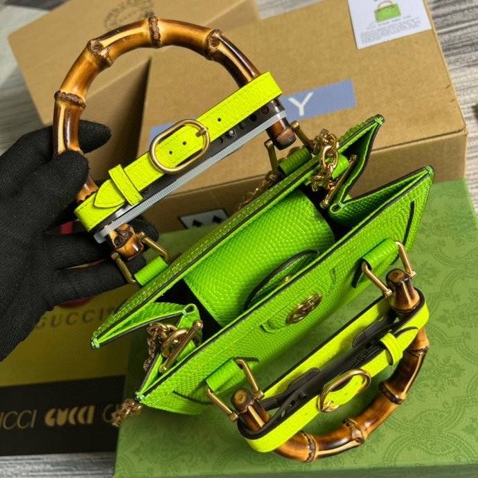An evolution of a bamboo handle tote first introduced in 1991, the GG Lizaed represents the notion of style in constant evolution and is reimagined with removable, Yellow belts—a nod to the functional bands used to keep the handles in shape.?Here, a mini version of the emblematic style is presented in Yellow.