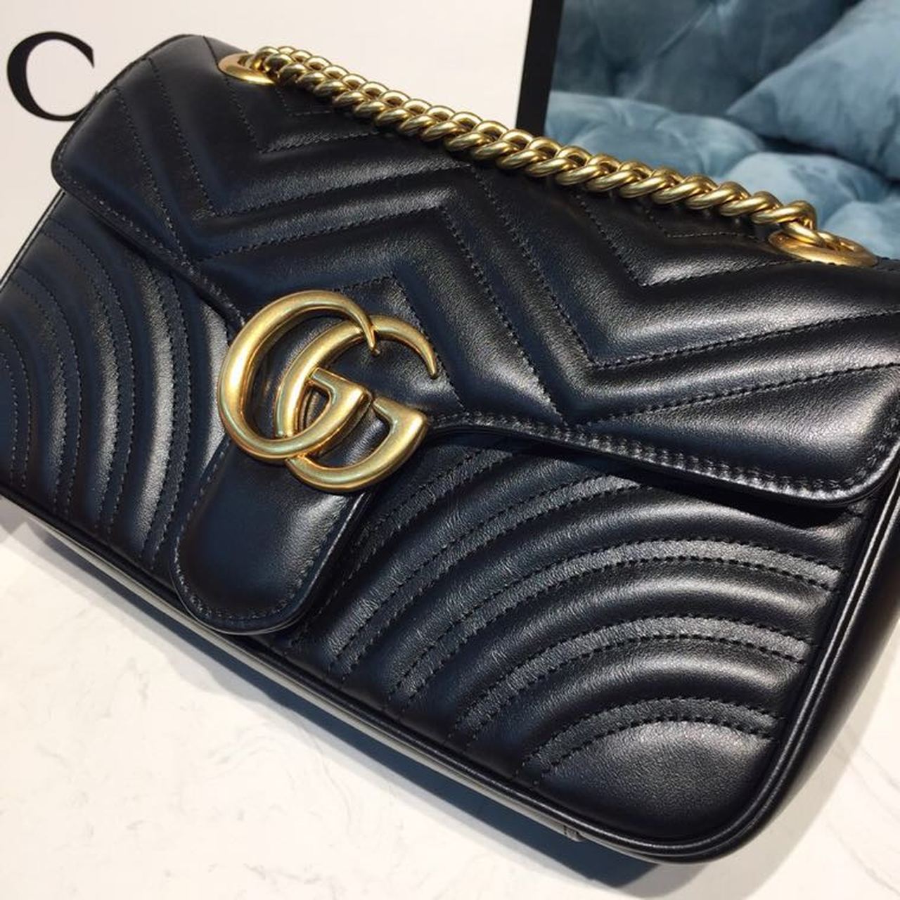 The small GG Marmont flap bag has a softly structured shape and an flap closure with Double G hardware. The sliding chain strap can be worn multiple ways, changing between a shoulder and a top handle bag. Made in matelassé chevron with a heart on the back.