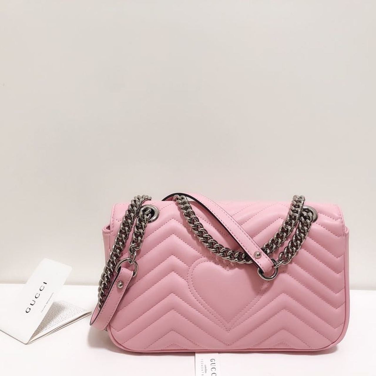 The small GG Marmont camera bag has a softly structured shape and a flap closure with Double G hardware. The sliding chain strap can be worn multiple ways, changing between a shoulder and a top handle bag. Made in matelassé chevron with a heart on the back.