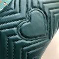 The small GG Marmont chain shoulder bag has a softly structured shape and an oversized flap closure with Double G hardware. The sliding chain strap can be worn multiple ways, changing betwetlm a shoulder and a top handle bag. Made in matelassé chevron with a heart on the back.