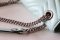 The small GG Marmont chain shoulder bag has a softly structured shape and an oversized flap closure with Double G hardware. The sliding chain strap can be worn multiple ways, changing betwetlm a shoulder and a top handle bag. Made in matelassé chevron with a heart on the back.