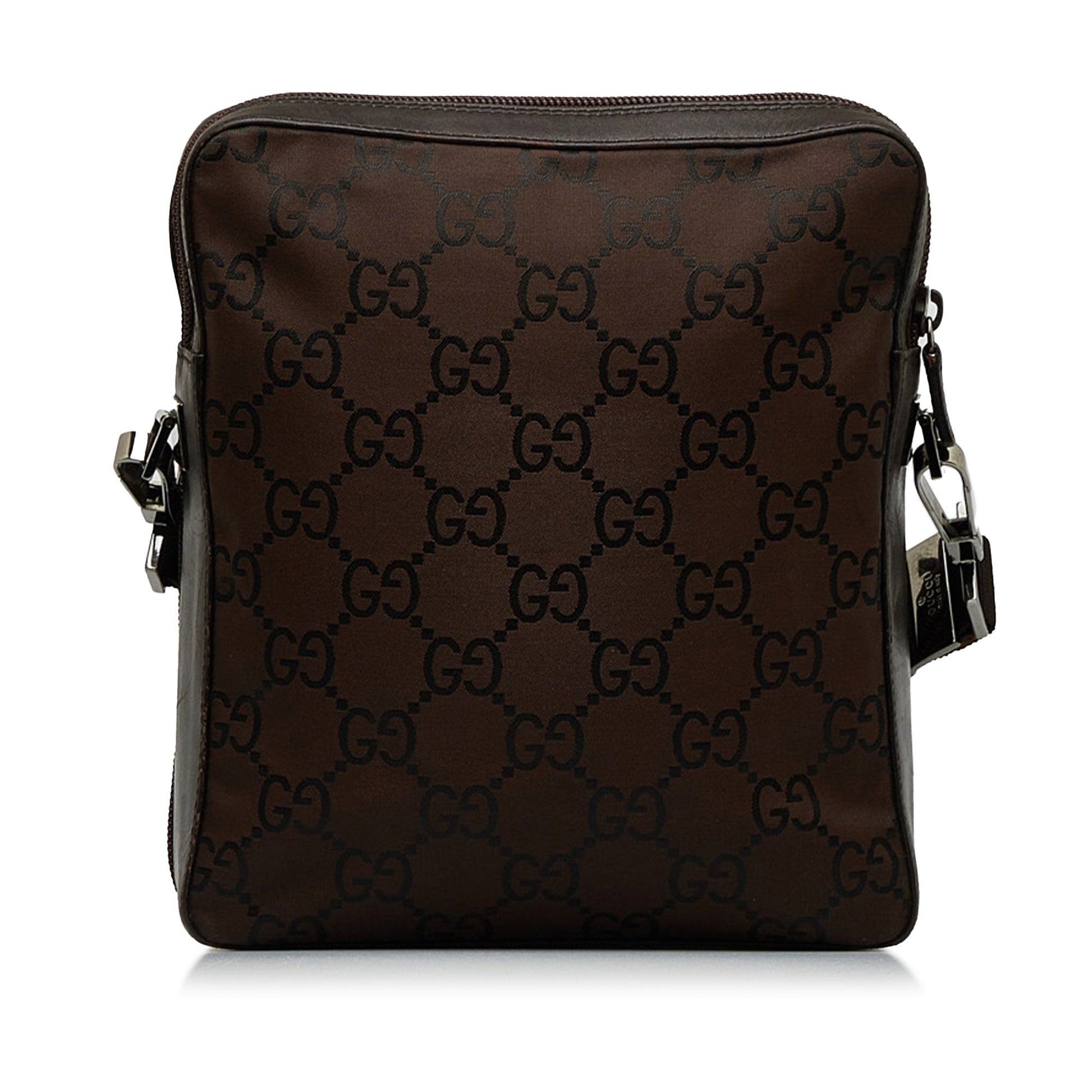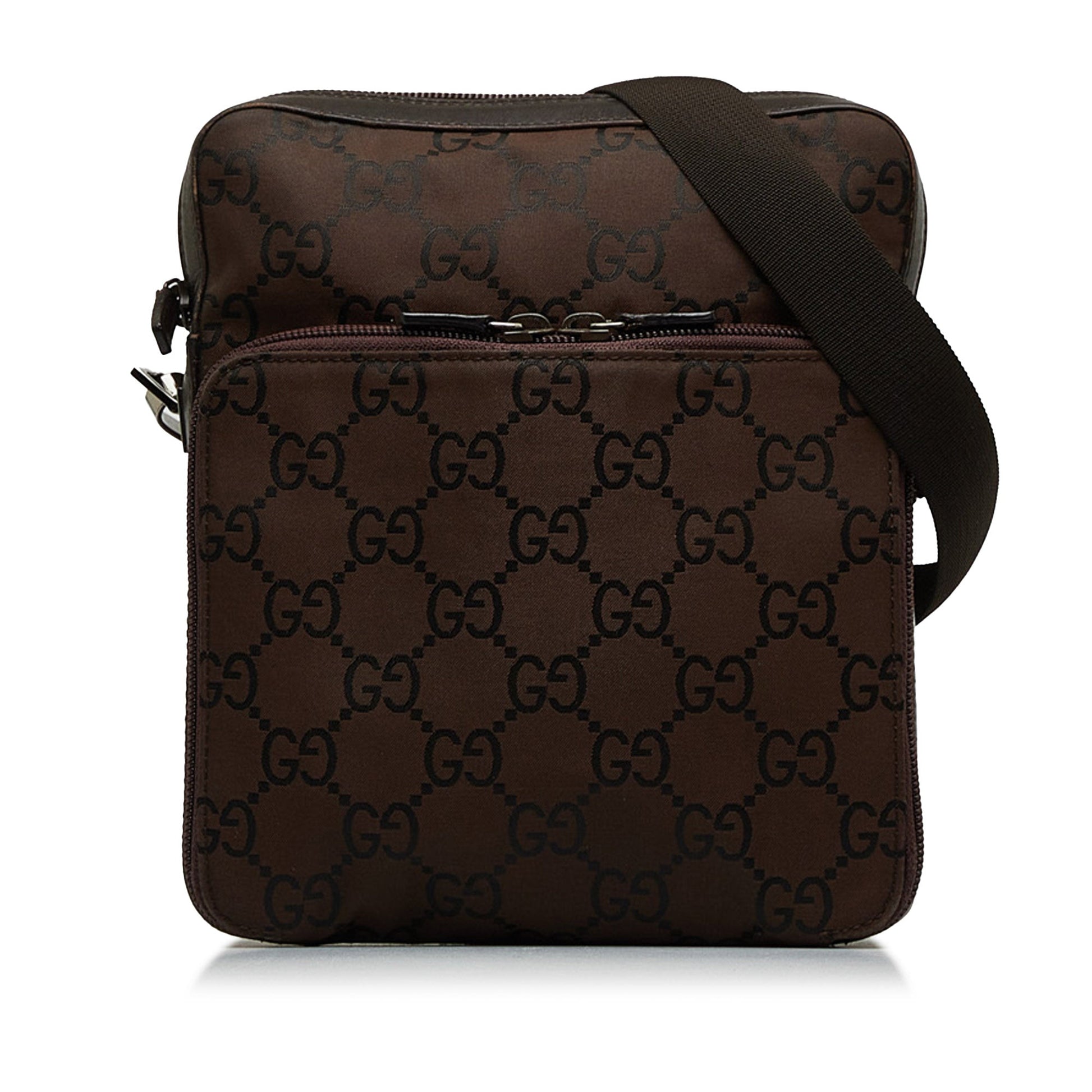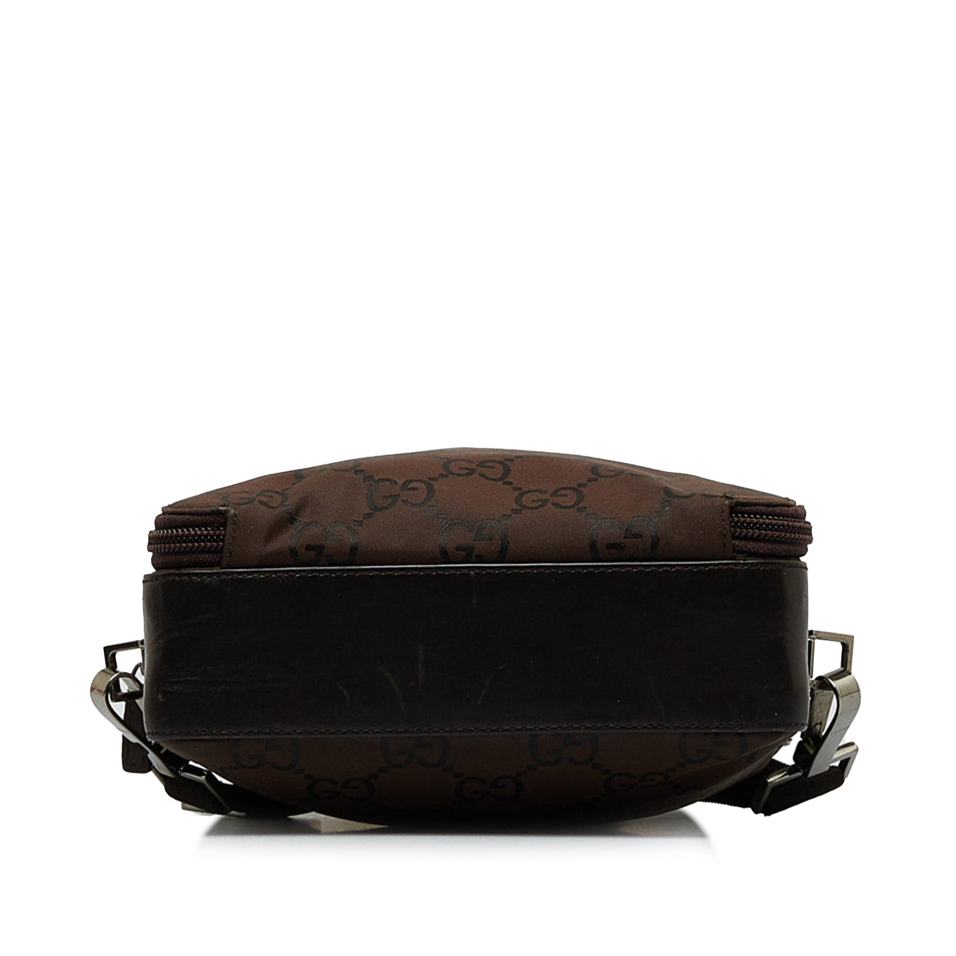 This crossbodyBag is made of nylon with leather trim, a flat leather shoulder strap, a zipper closure at the top, an exterior zipper pocket and interior zipper and slip pockets.