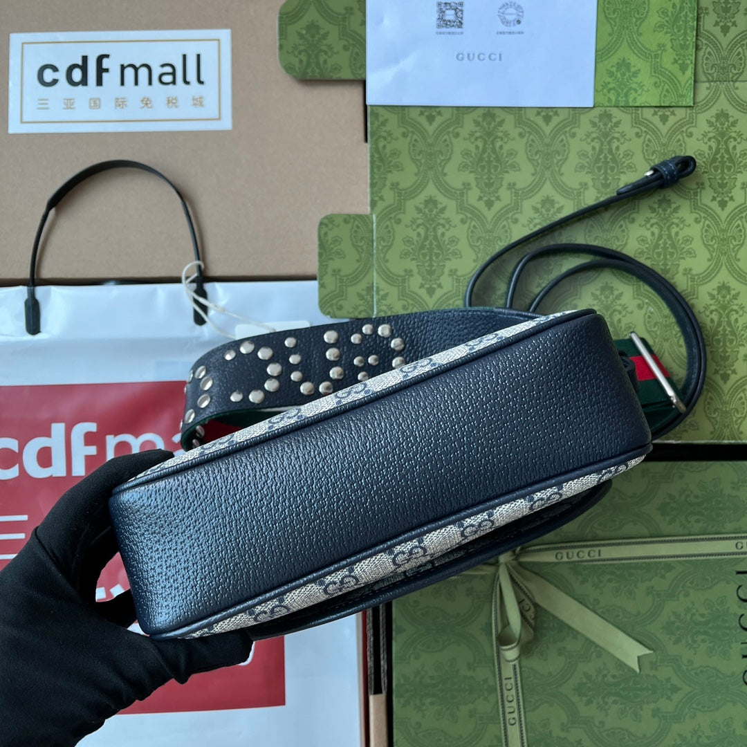 The Ophidia bag is reinvented in new and unexpected ways. The perforations and rivets recall the scene of punk culture and adorn the historical design to provide a unique version of this archival style. Crafted from the House’s signature GG Supreme , this extra-small shoulder bag is crafted in a traditional blend of beige and ebony, providing a playful contrast.