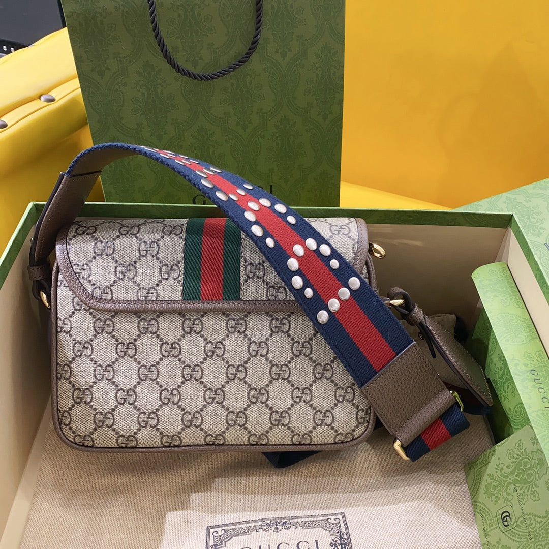 The Ophidia bag is reinvented in new and unexpected ways. The perforations and rivets recall the scene of punk culture and adorn the historical design to provide a unique version of this archival style. Crafted from the House’s signature GG Supreme , this extra-small shoulder bag is crafted in a traditional blend of beige and ebony, providing a playful contrast.