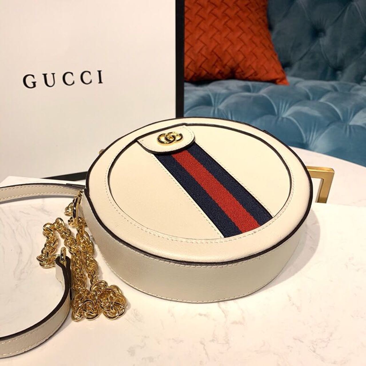 The world of Ophidia evolves with the introduction of a round mini bag with a chain shoulder strap. Crafted in GG Supreme canvas with inlaid gretlm and red Web stripe, the accessory is tlmhanced by a petite play on the Double G, an archival GG code from the ’70s that appears atop a tab detail and on the zipper pull.