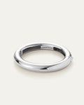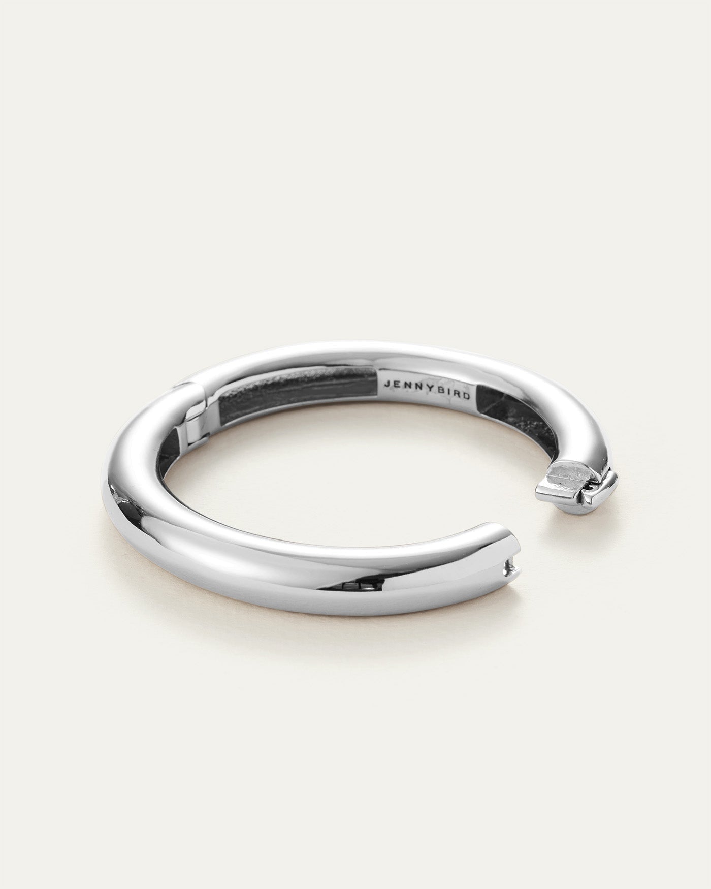 A super bold, tubular bangle to wear on its own or finish your arm stack. This wide, custom bangle opens and closes with a hinge and tab lock closure. To open, push down on the highest point of the clasp before pulling the bangle open. To close, listen for a "click" to ensure tab is locked properly. Note: this design wears best when the closure is secured on the inside of your wrist, and the updated water-durable steel ensures the design stays put. Finished in high-polish silver.