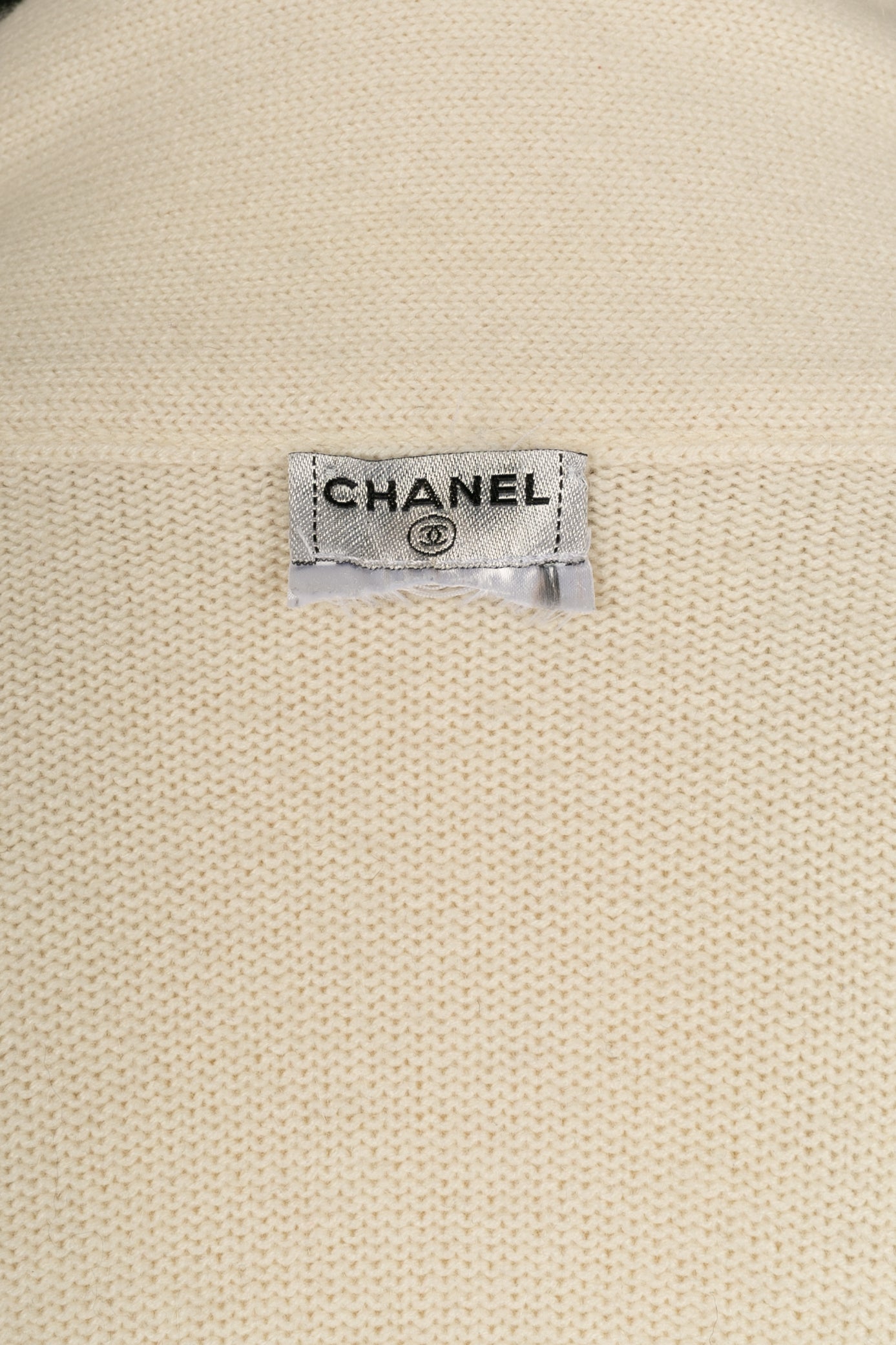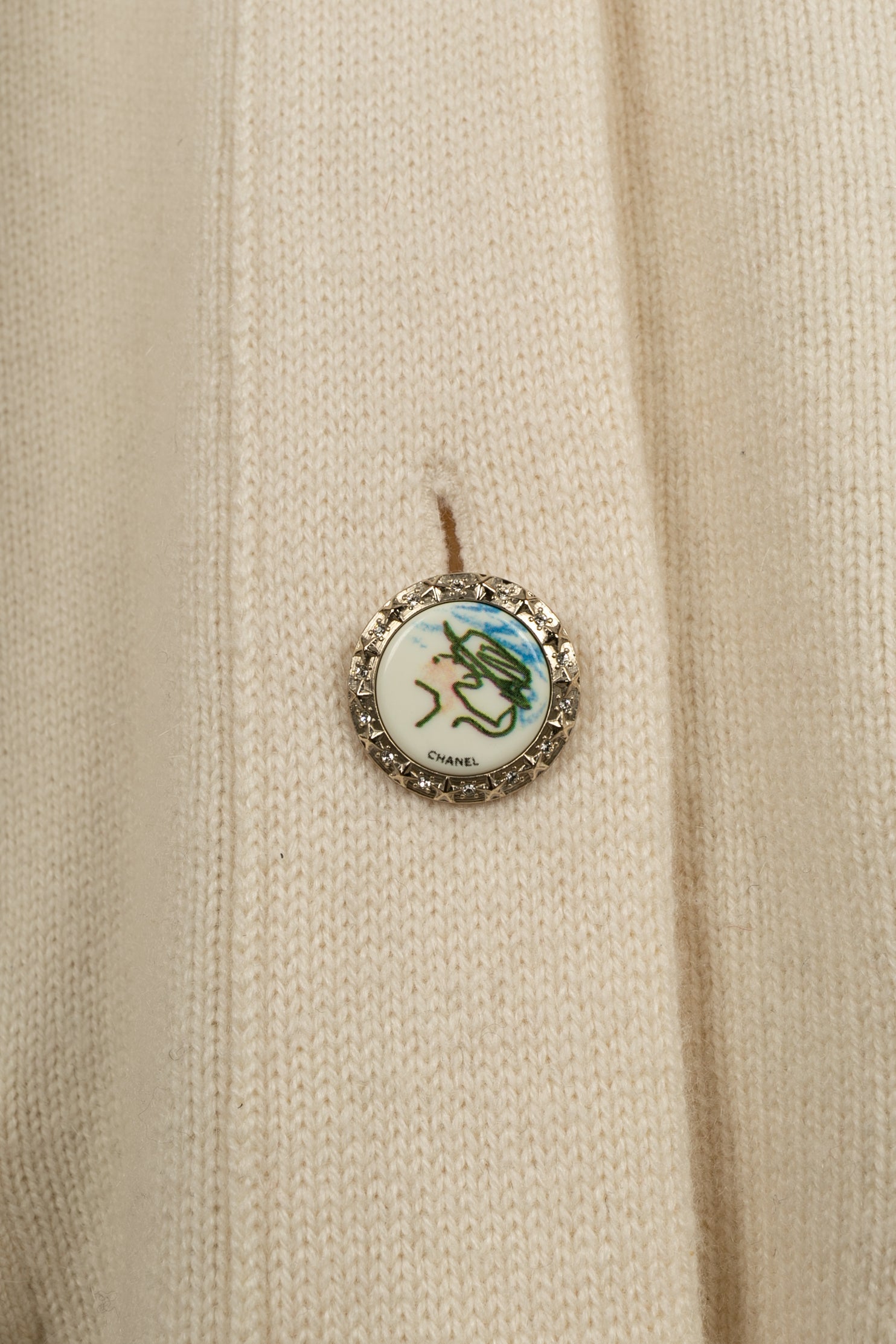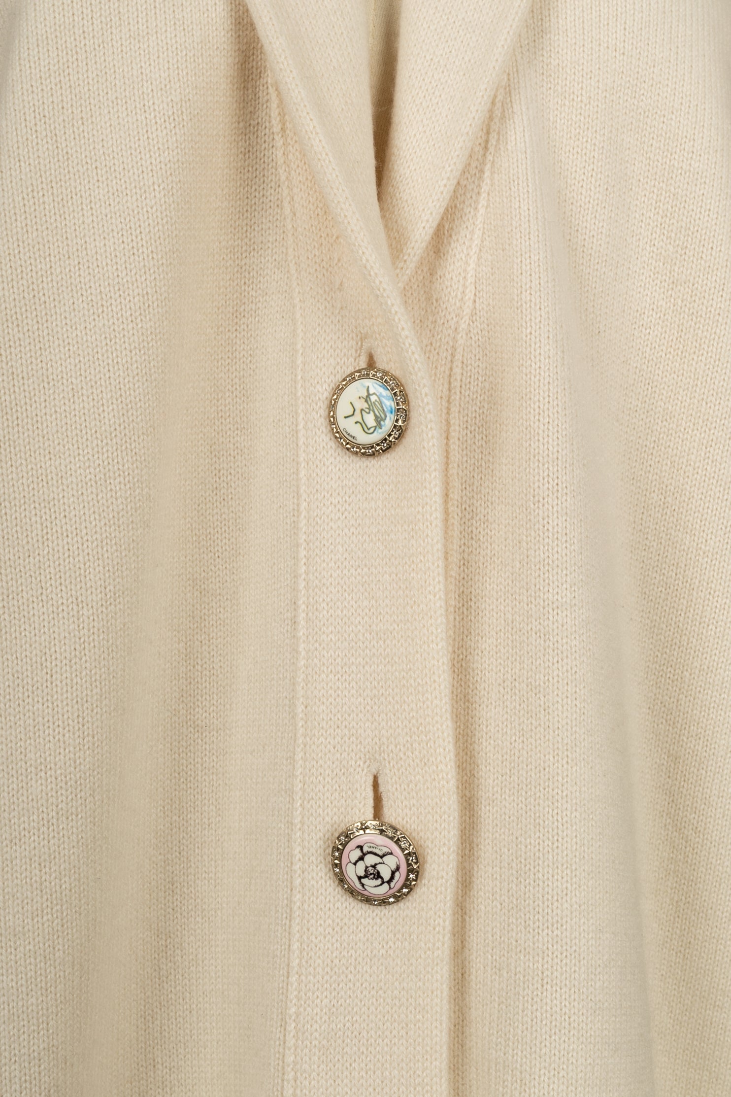 CHANEL - Gilet en cachemire blanc �crue et boutons en m�tal et r�sine. Pas de taille indiqu�e, il correspond � un 44FR.