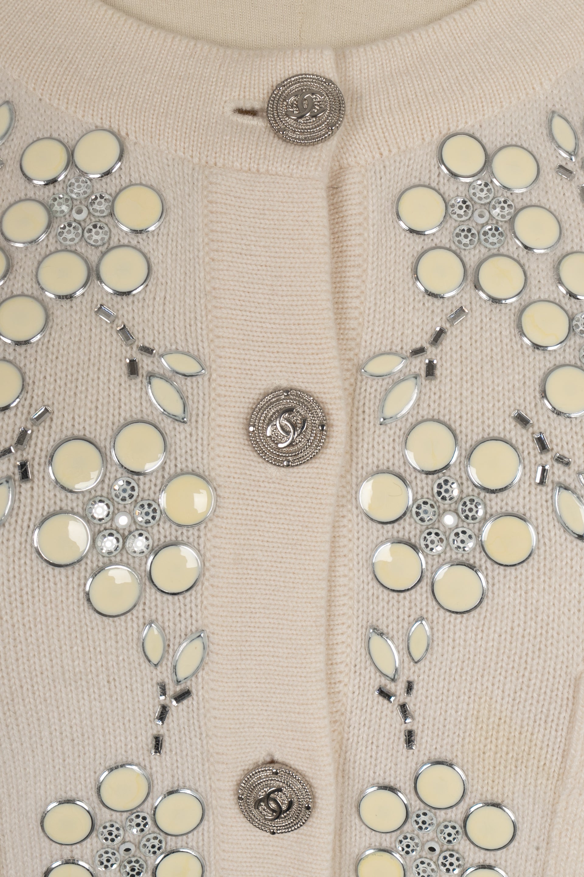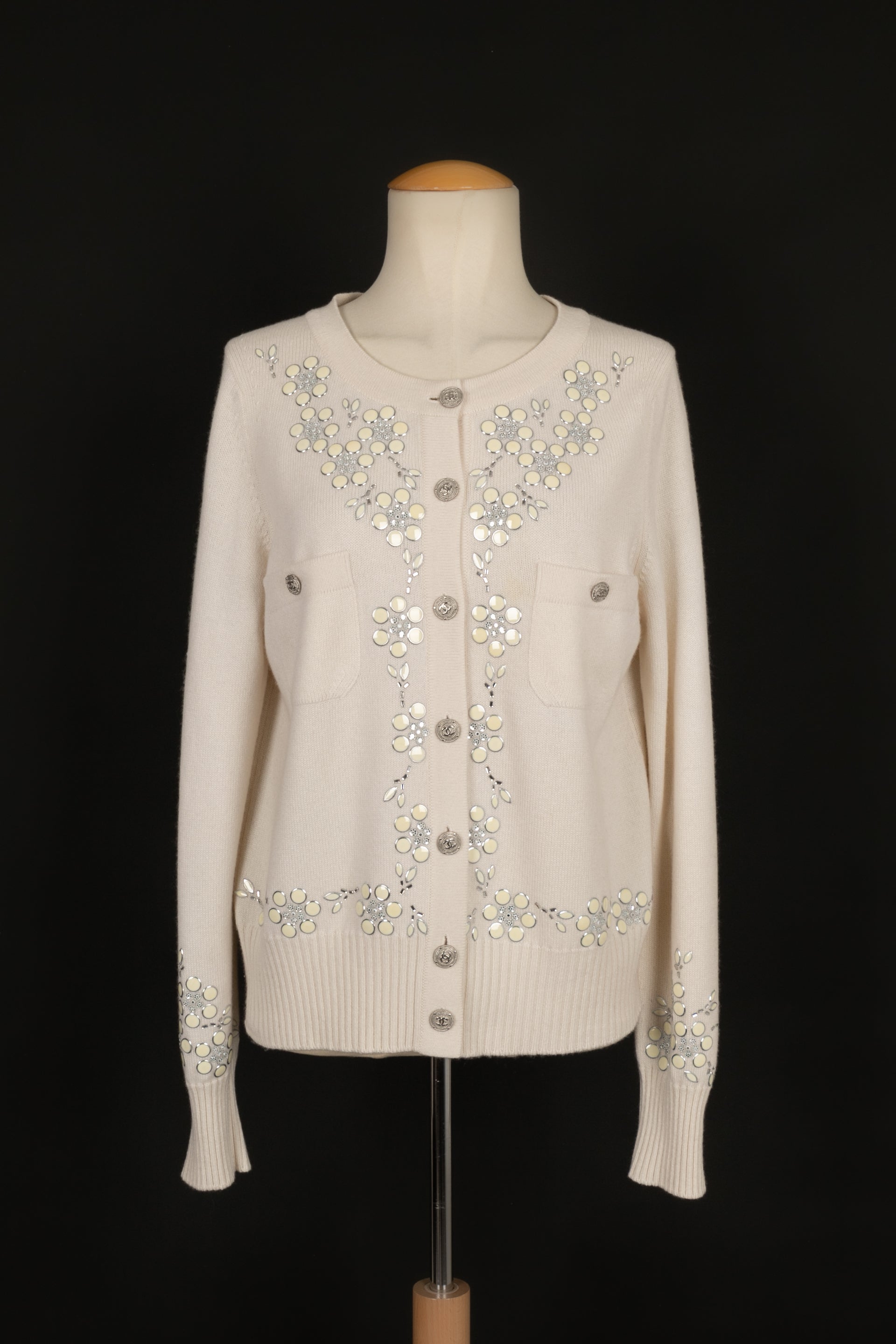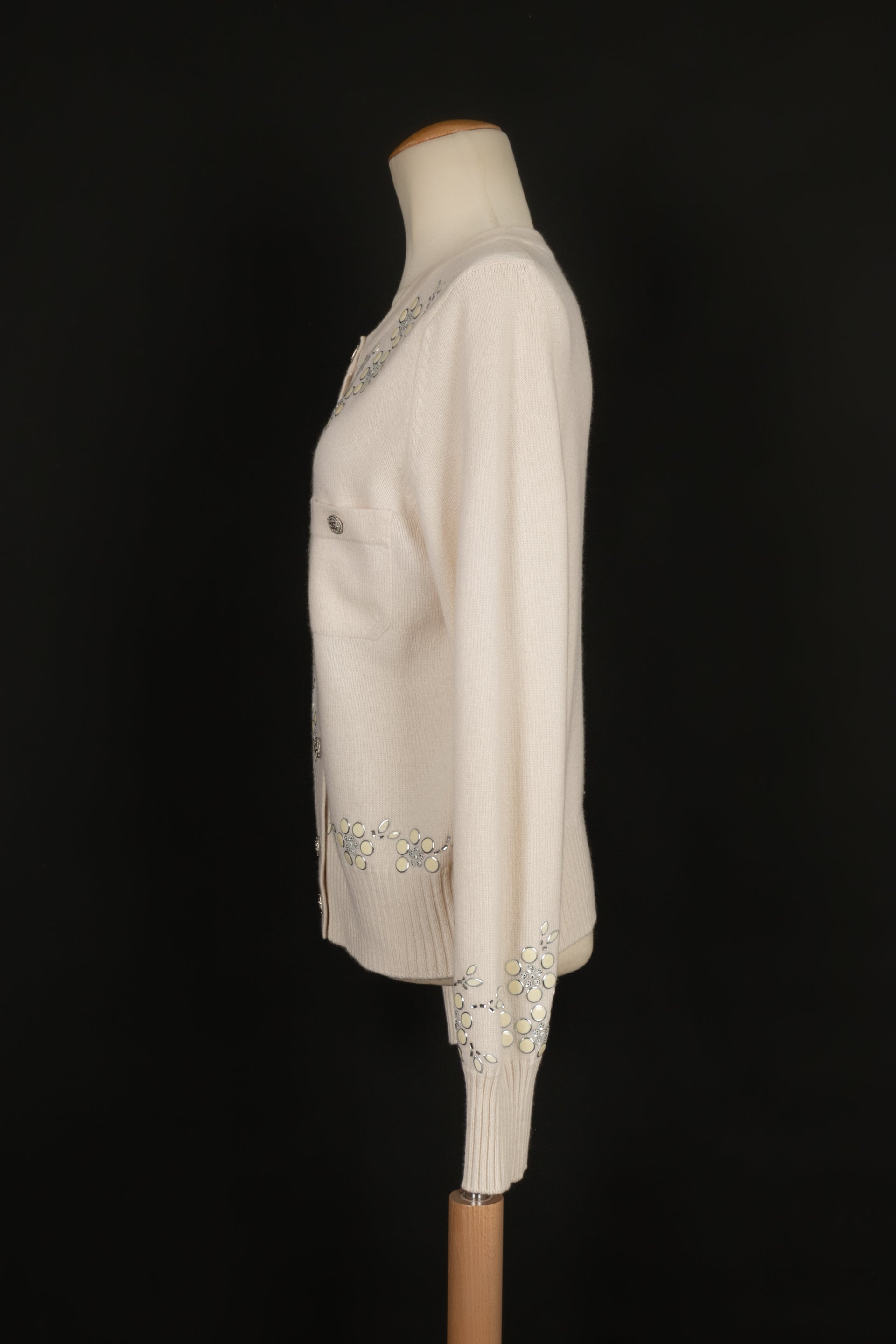 CHANEL - (Made in United Kingdom) Gilet en cachemire blanc cassé et application de décors figurant des fleurs. Taille 42FR.