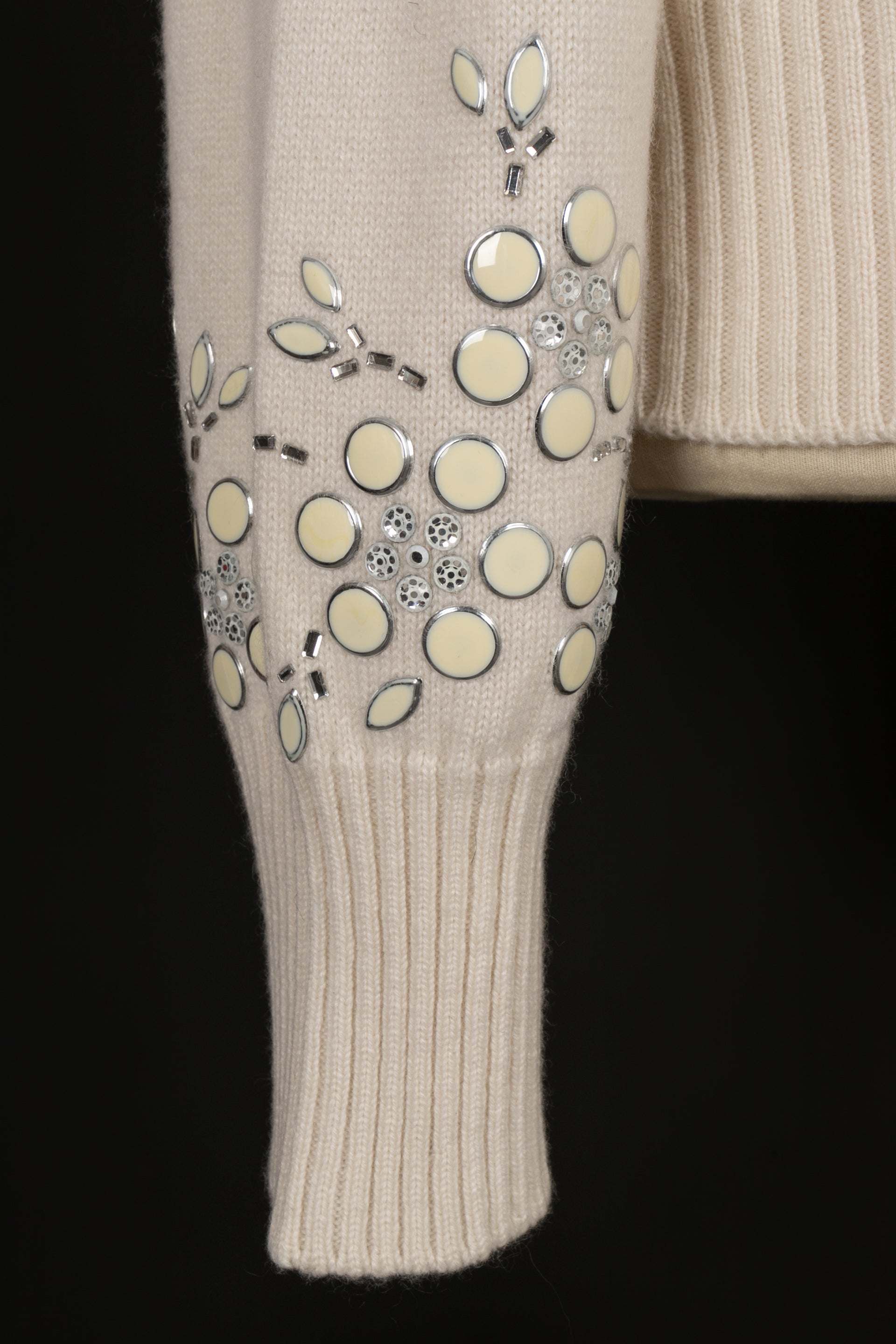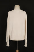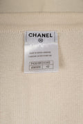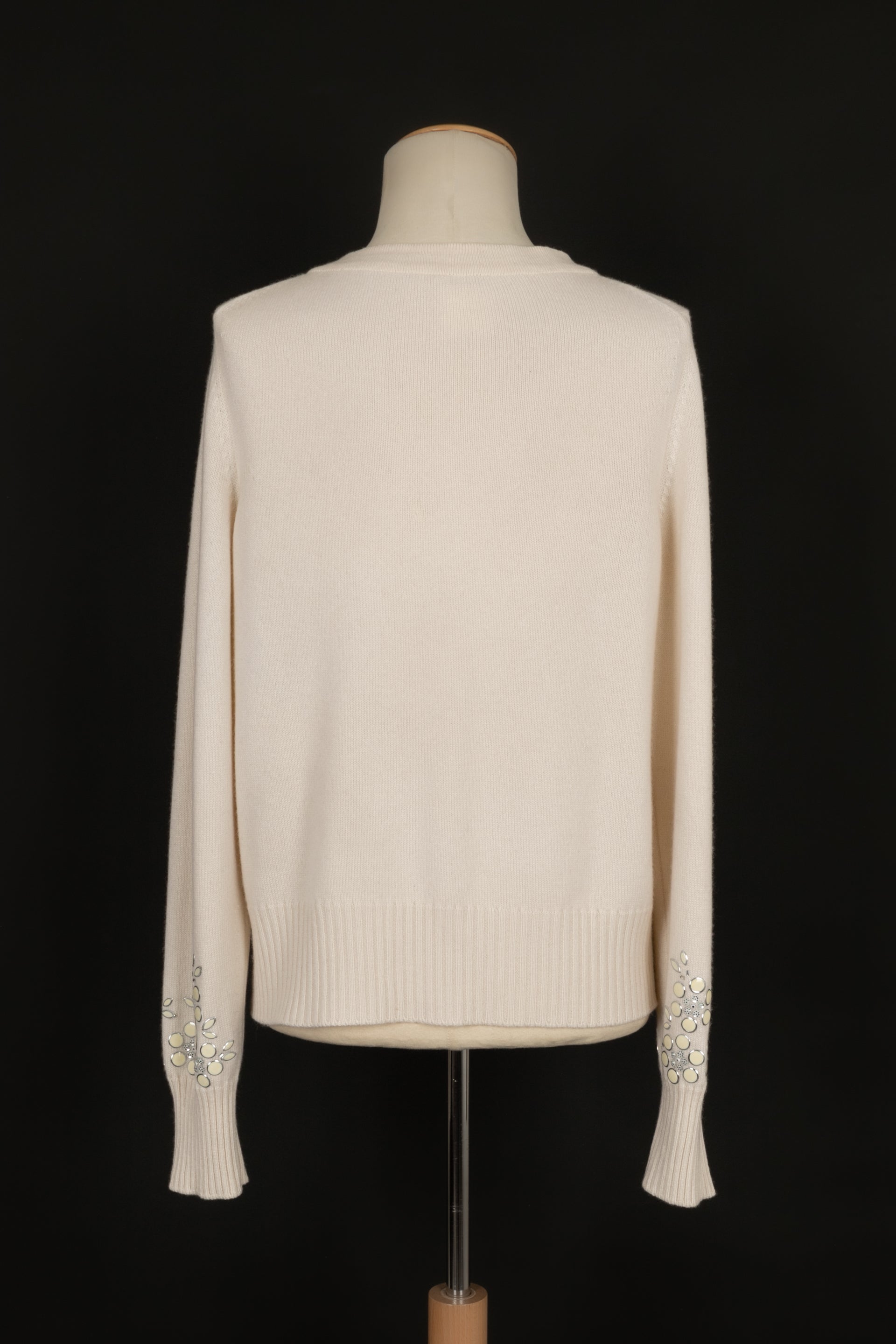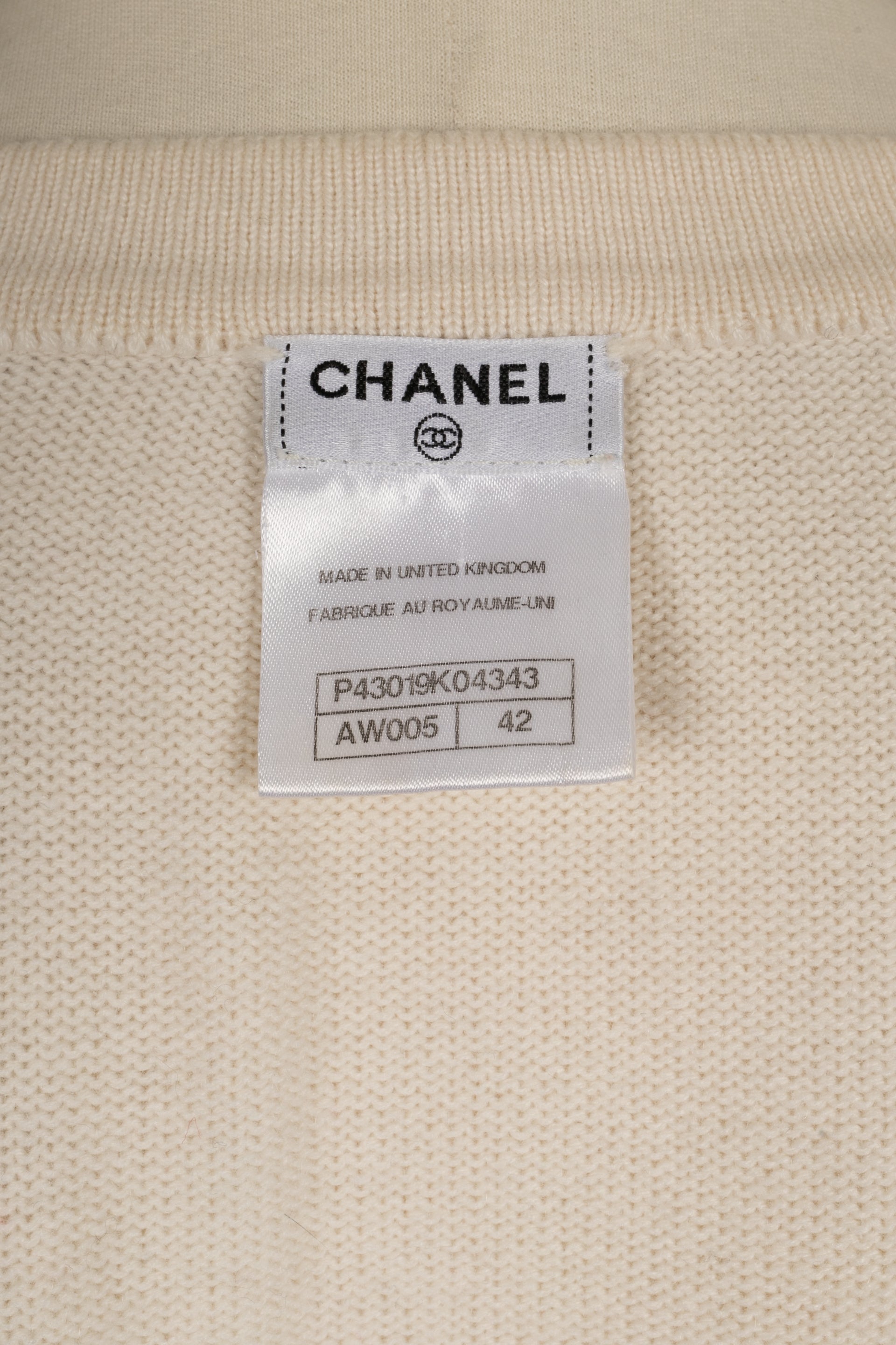 CHANEL - (Made in United Kingdom) Gilet en cachemire blanc cassé et application de décors figurant des fleurs. Taille 42FR.