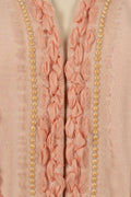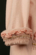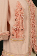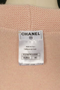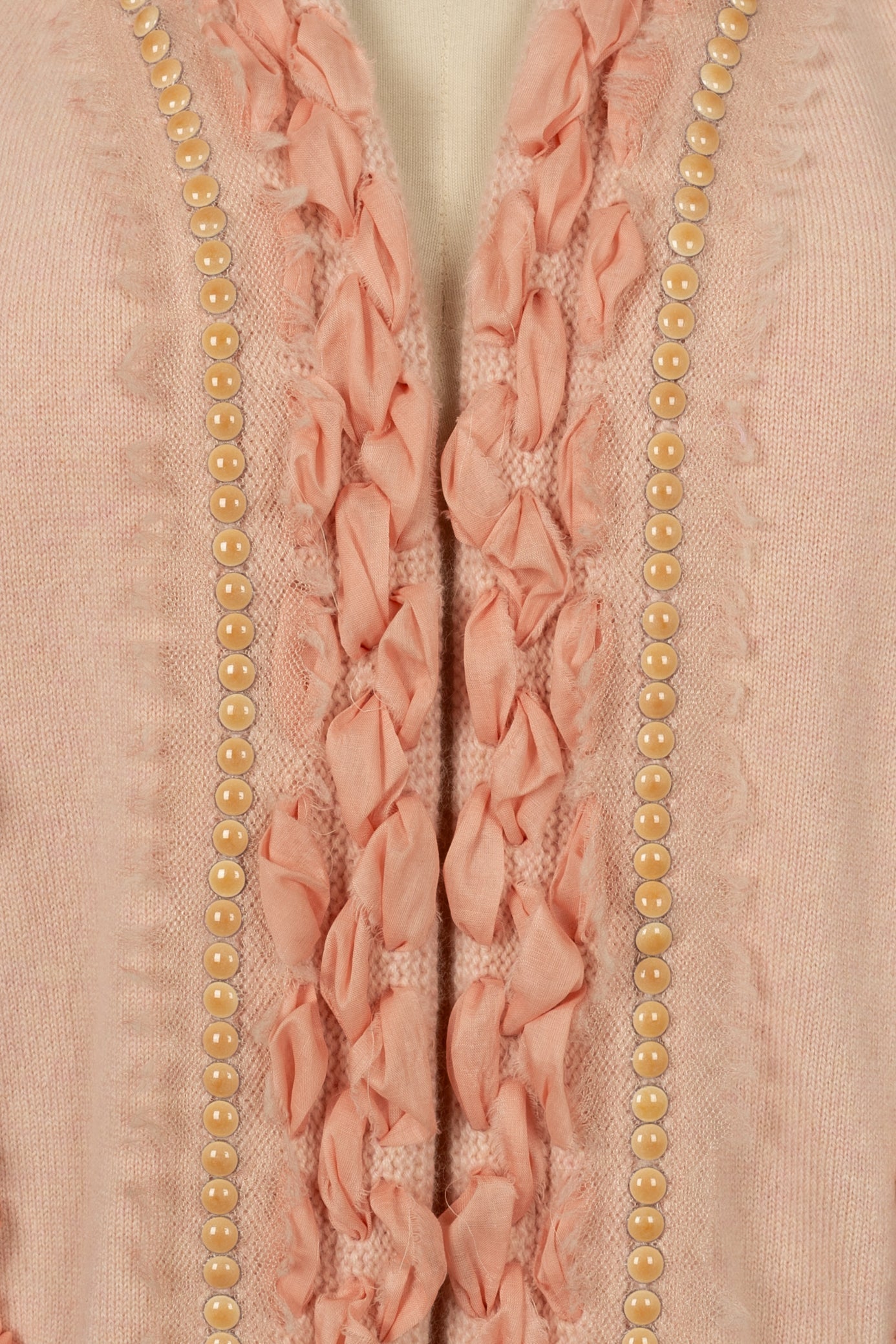 CHANEL - (Made in Italy) Gilet en cachemire rose agr�ment� de rubans, de perles... Taille 40FR. A signaler, petit d�faut dans la maille pr�sent dans le dos du gilet.