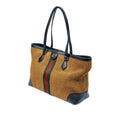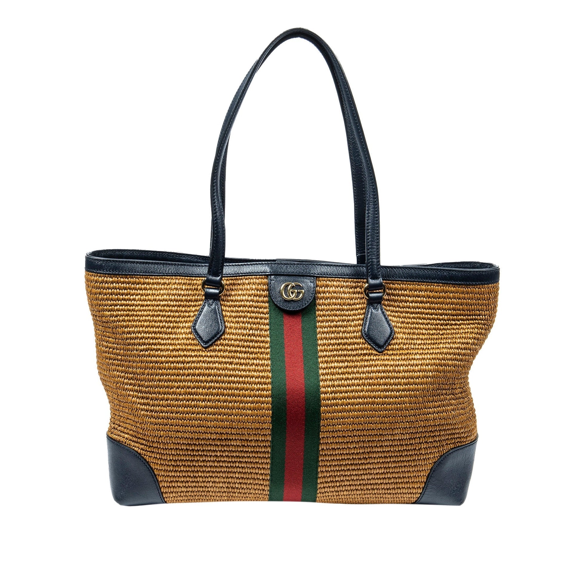 Product Details: Brown Gucci Medium Raffia Ophidia Tote Bag. This tote bag features a raffia body with leather trim and web detail, flat leather shoulder straps, an open top with a magnetic snap button closure, and interior zip and slip pockets. 10.2" L x 14.6" W x 5.1" D, 9.1" drop. Serial number 631685 525040.
