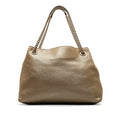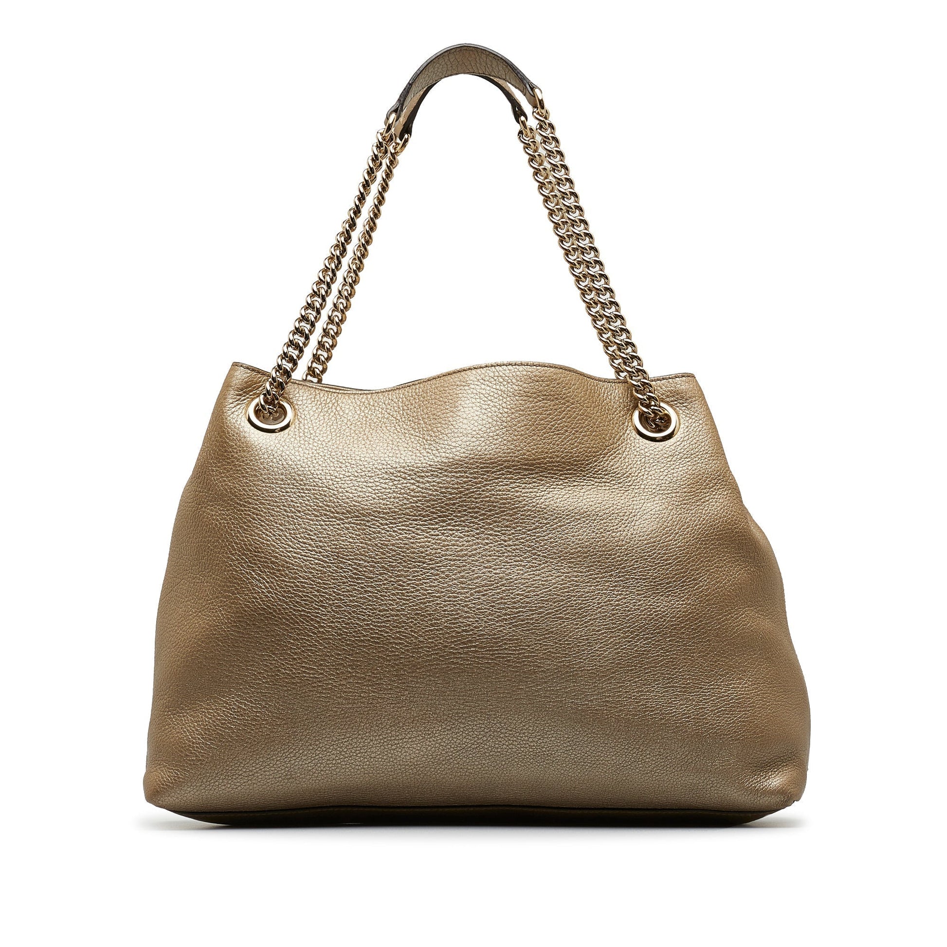Product Details: Gold Gucci Medium Soho Chain Tote. The Soho Chain features a leather body, curb chain straps, an open top with a lobster claw closure, and interior zip and slip pockets. 10.8" L x 14.8" W x 4.7" D, 7.9" drop. Serial number 308982 204991.