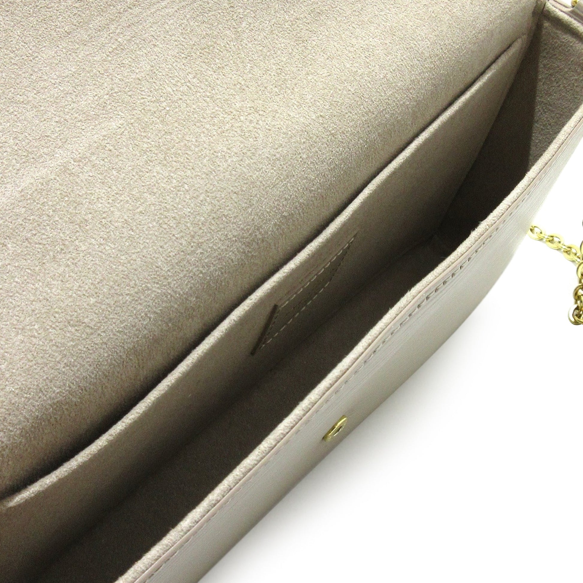 Product Details: Gray Louis Vuitton Epi Pochette Felicie Crossbody Bag. The Pochette Felicie features an epi leather body, a detachable gold-tone chain shoulder strap, a top flap with a snap button closure, and an interior slip pocket. 4.7" L x 8.7" W x 1.2" D.