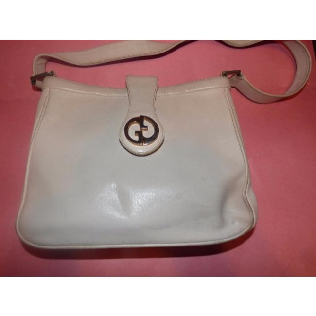 * For sale is a unique, vintage, mod, Gucci, white leather handbag with a gold GG flap snap lock! It is a unique vintage style that would be a great used as your signature white purse! Gucci brought back this style from 1973!