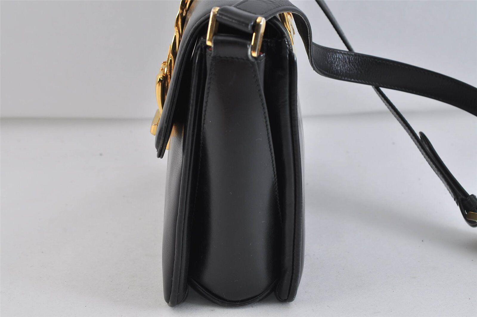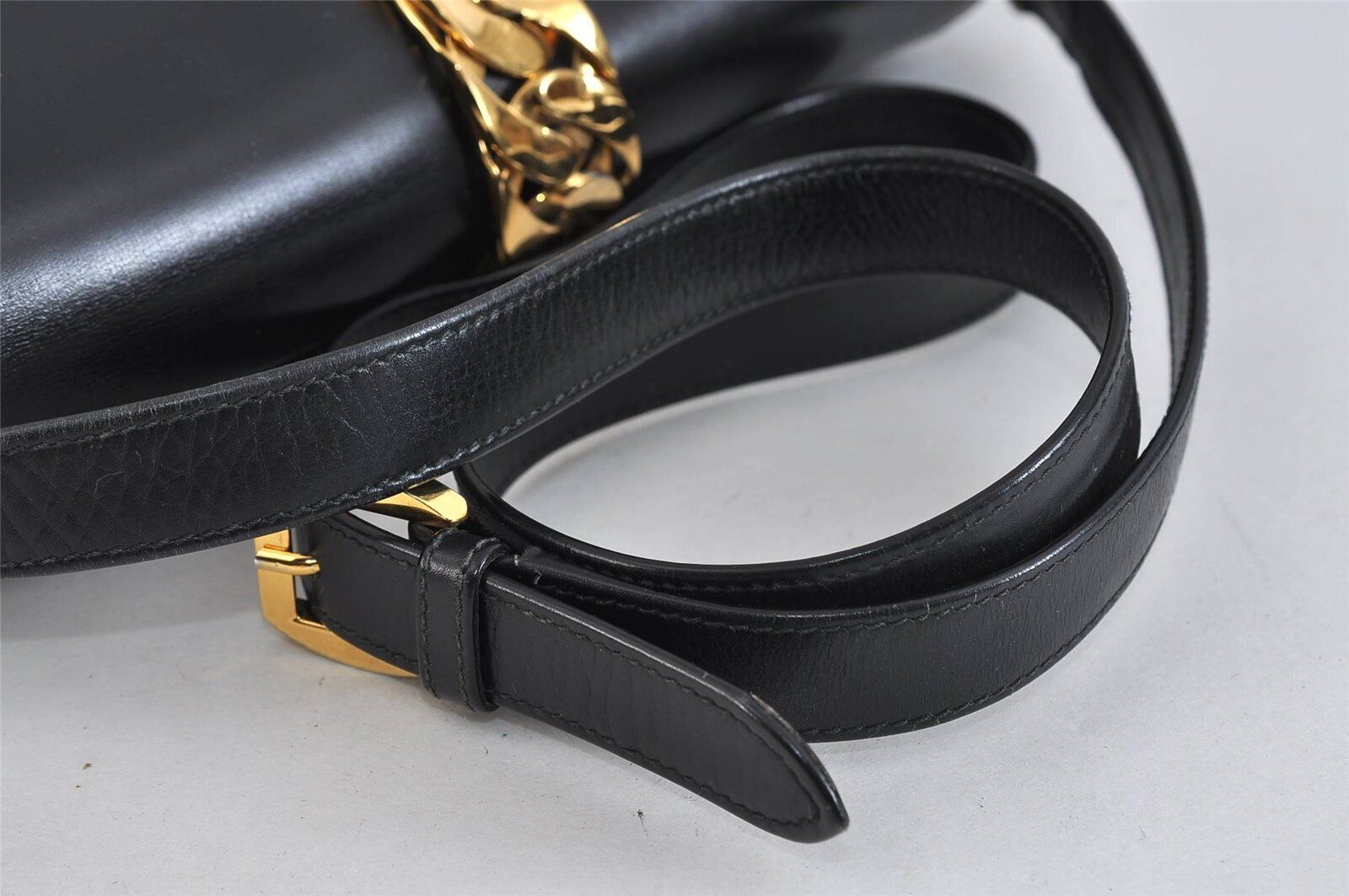 The bag is made of supple navy leatherwith a bold gold zipper accent down the center and as the locking closure, and the buckles that the strap attaches to on both sides. The strap can be adjusted. This is a chic, edgy, early Gucci saddle bag style purse!