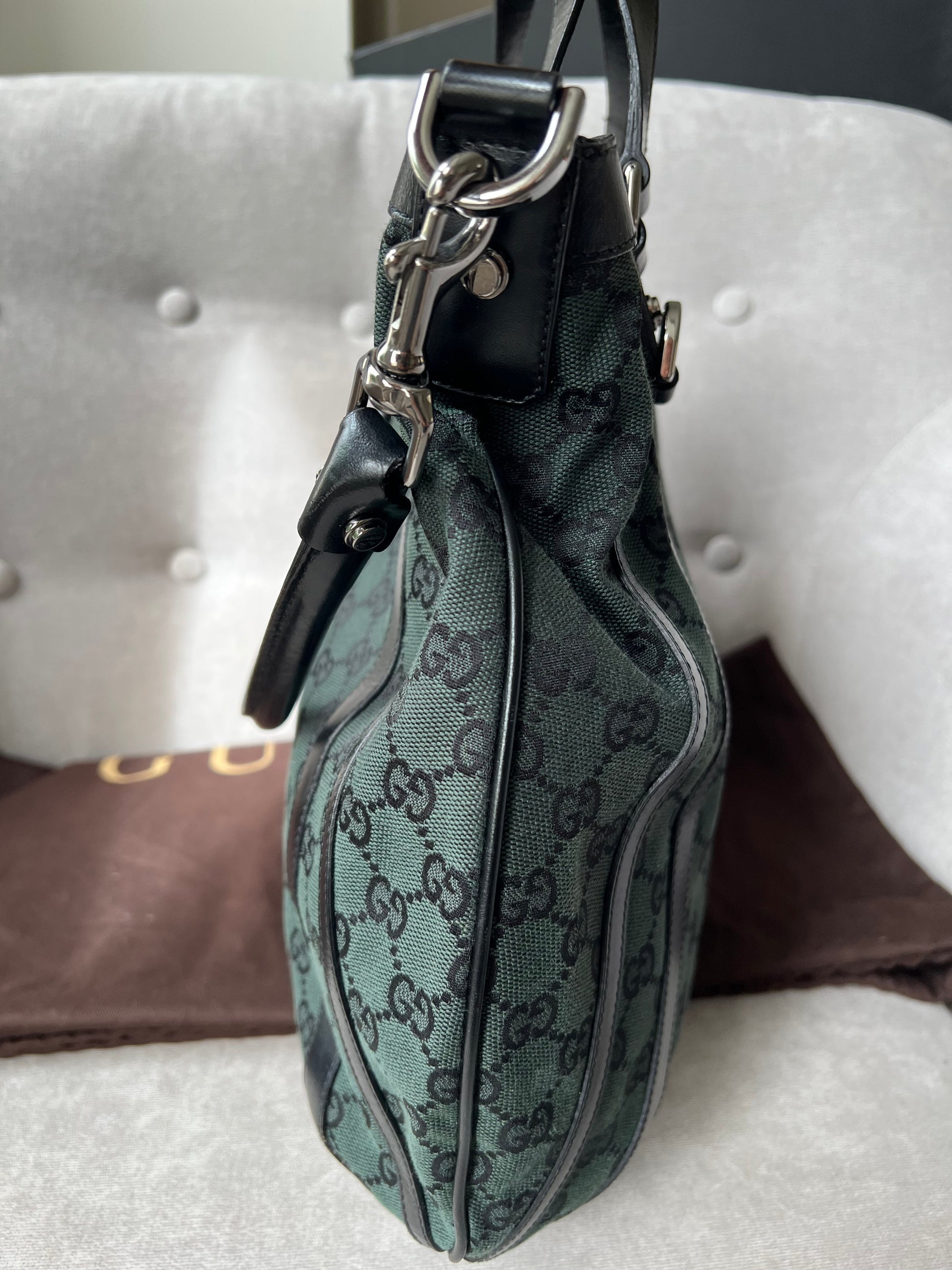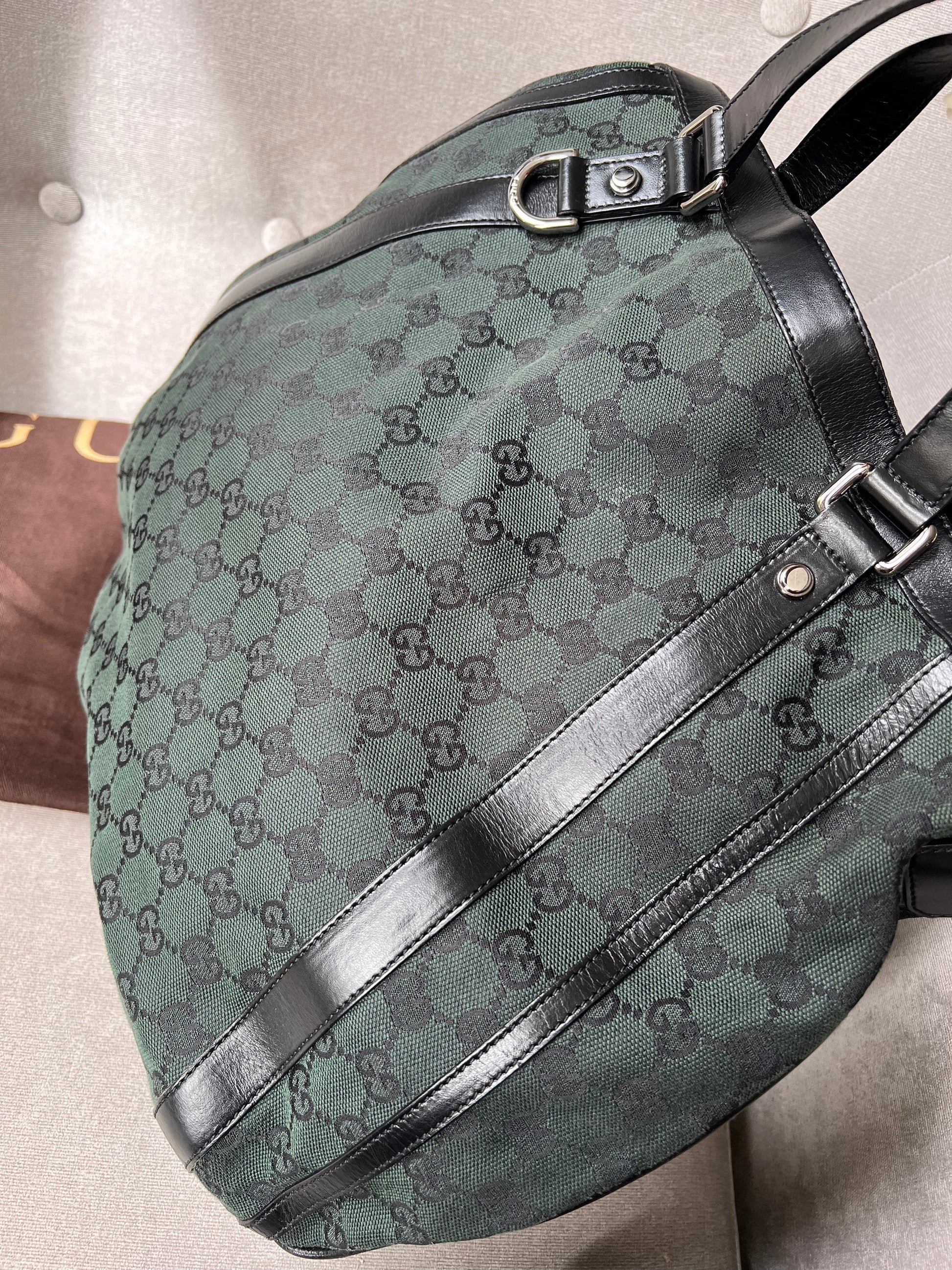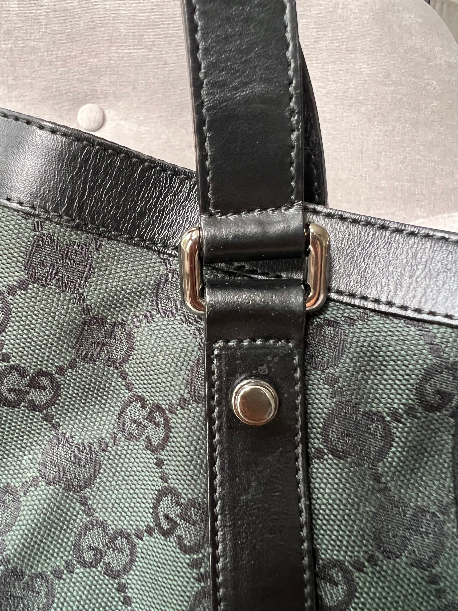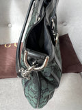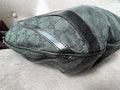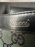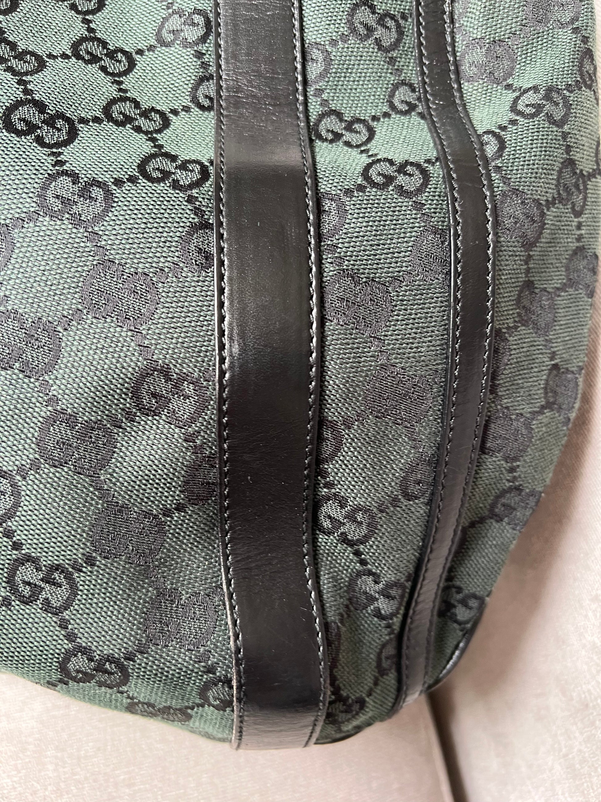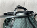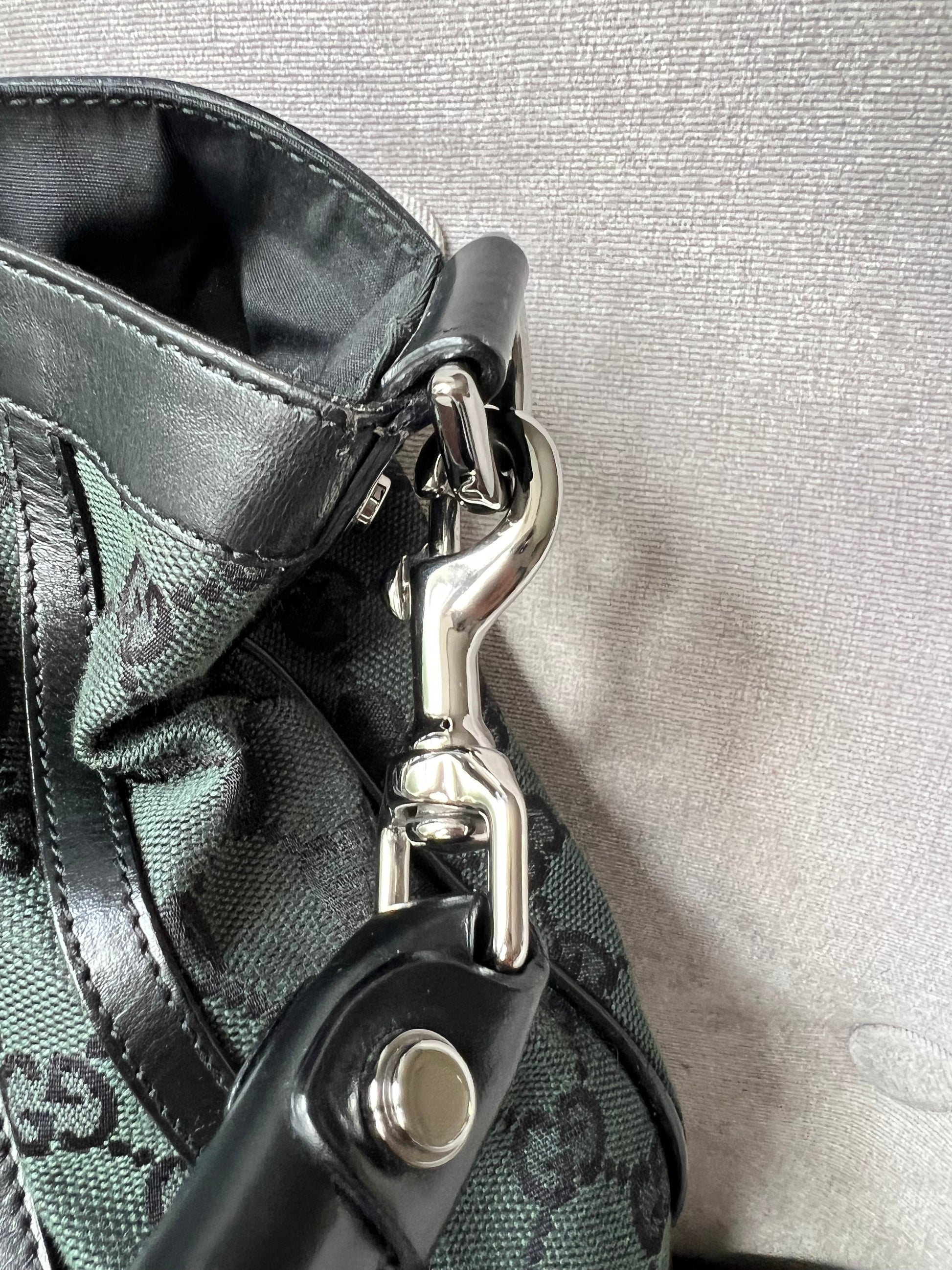 Gucci Vintage GG Tote in Dark Green Monogram Canvas with black leather trim with pale gold hardware. This medium to large, light and practical tote is an ideal bag for day to day use. A simple, open top with magnetic closure with two short top handles and a detachable longer handle. Can be carried by hand, over shoulder or in the crook of the arm.