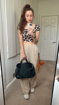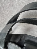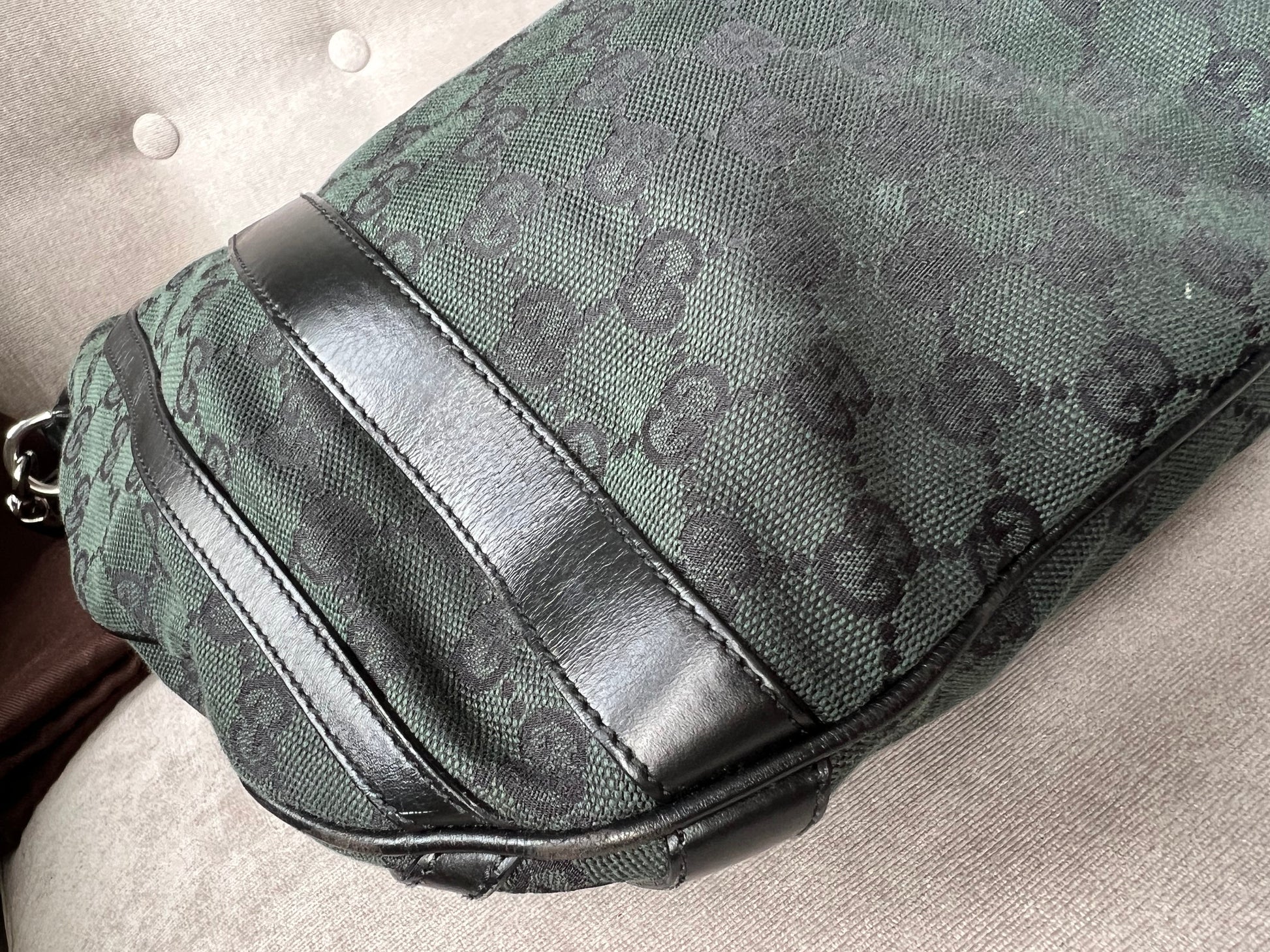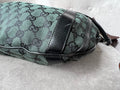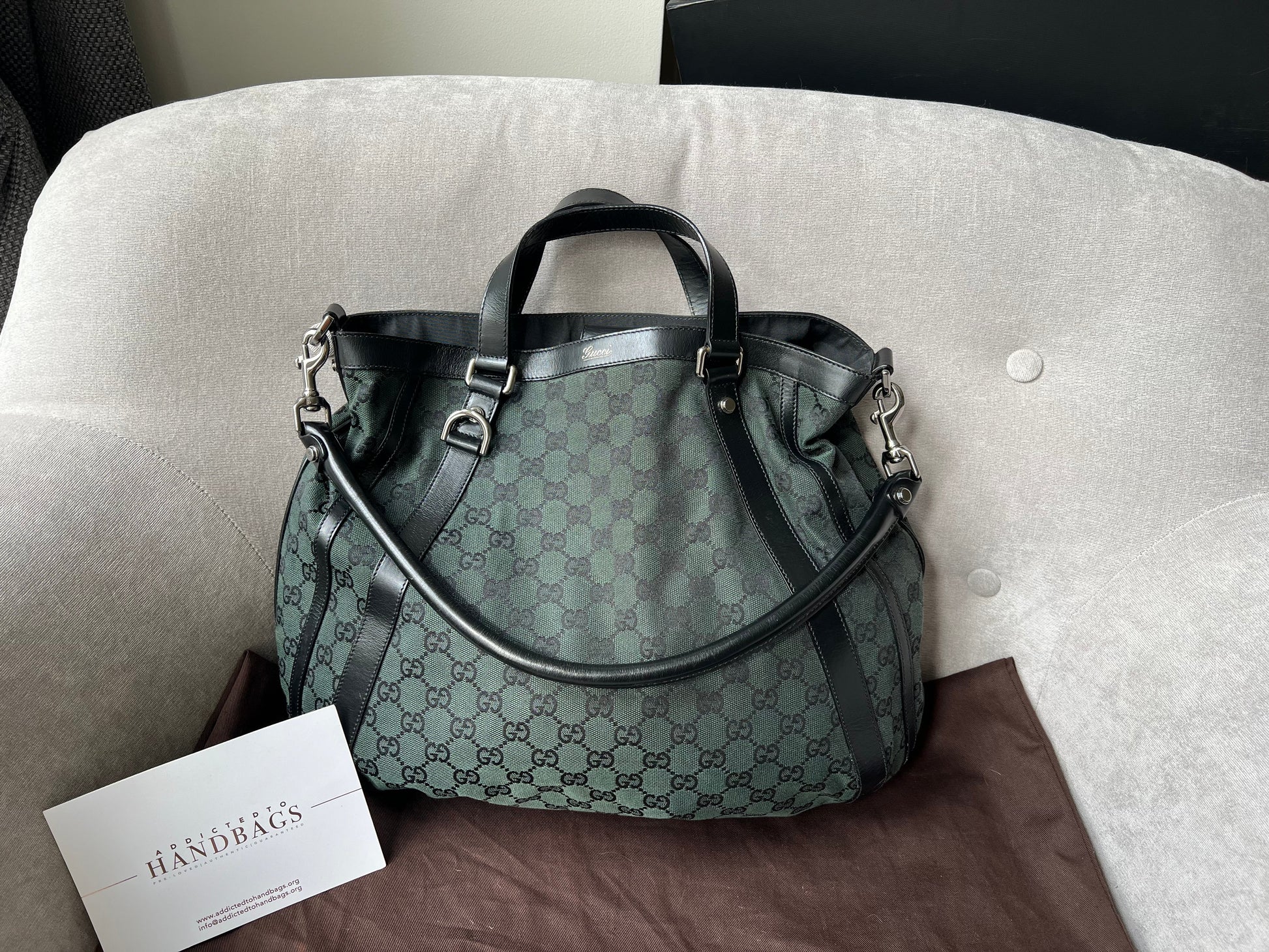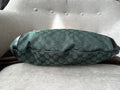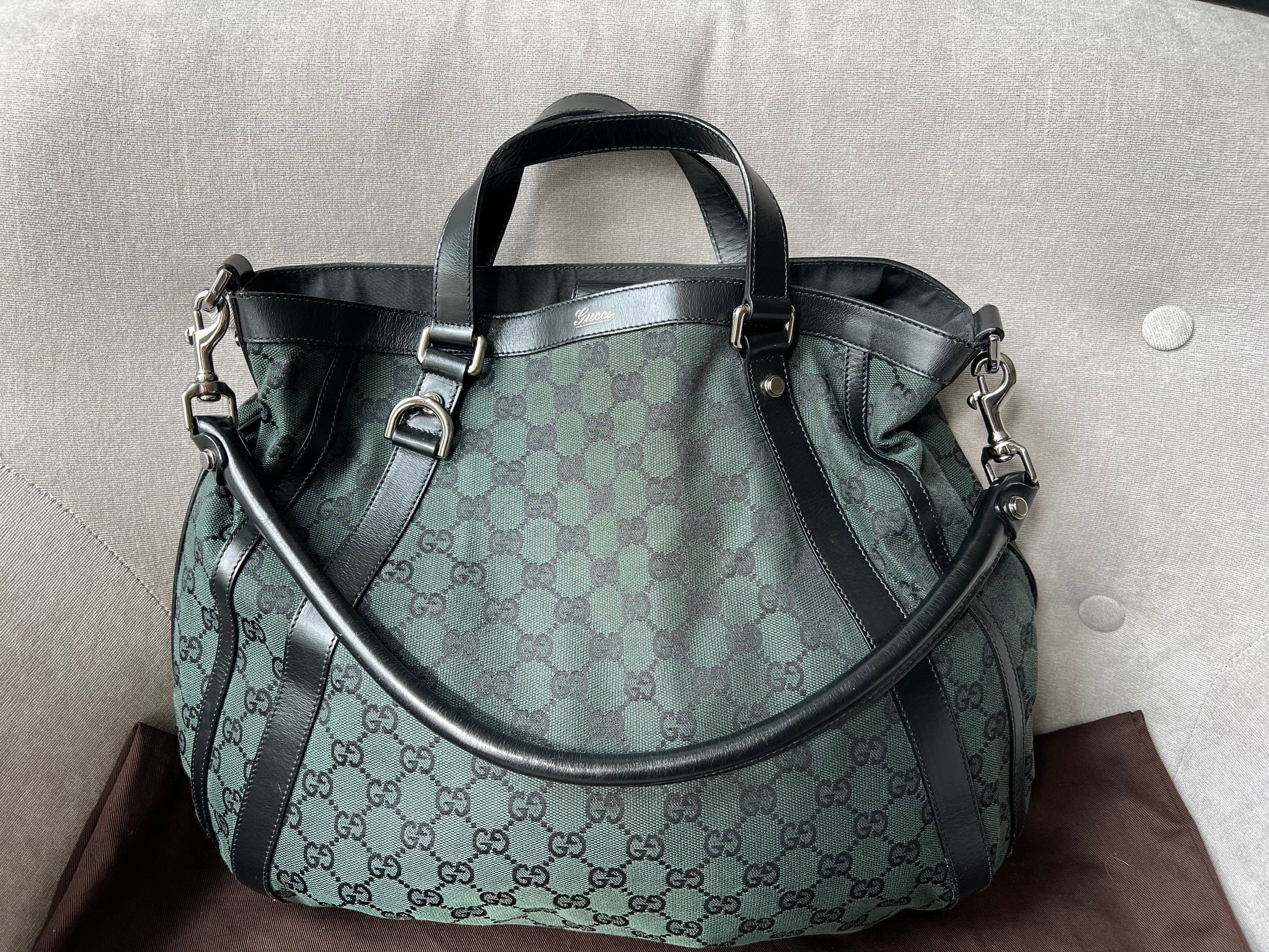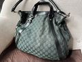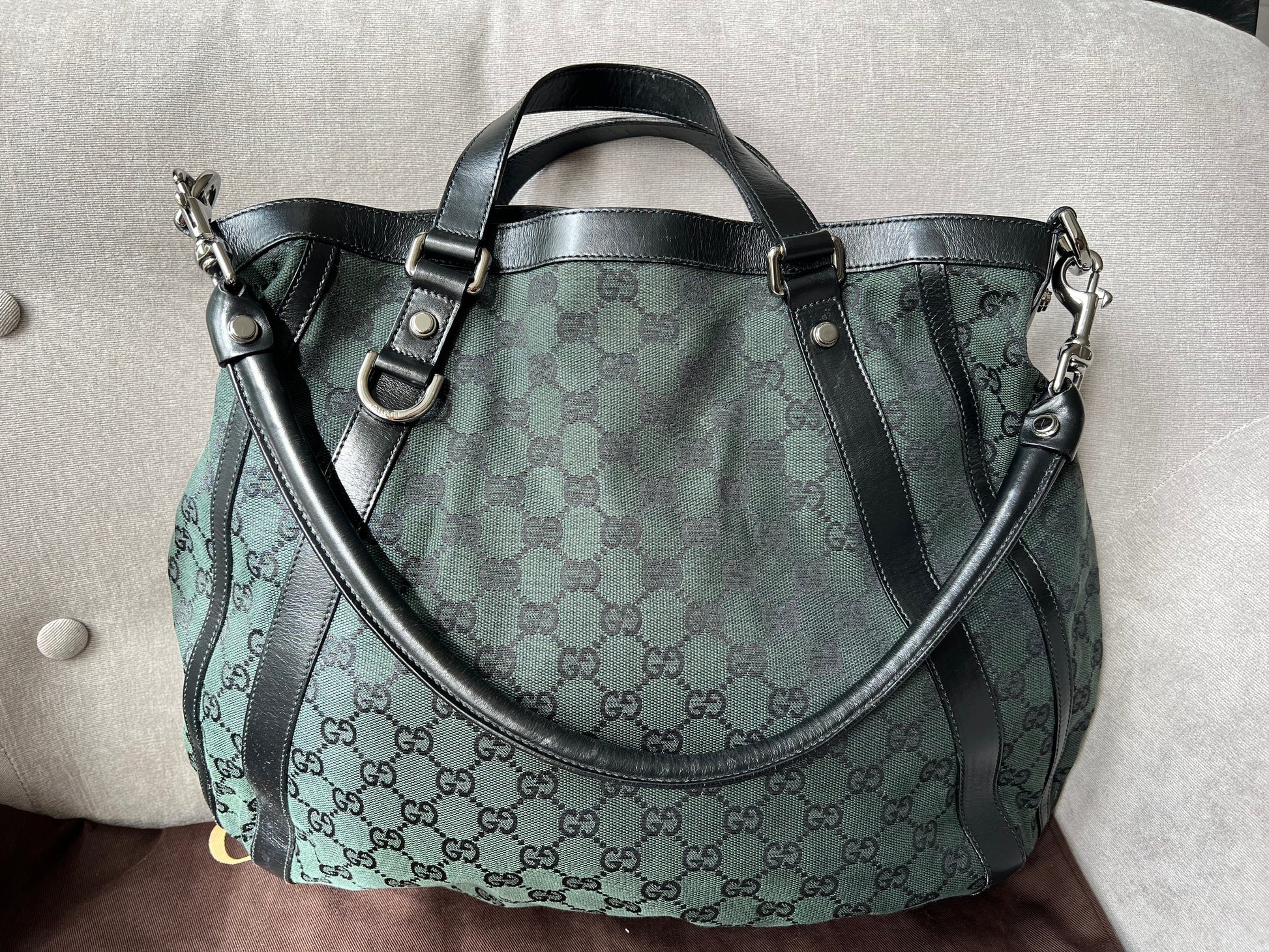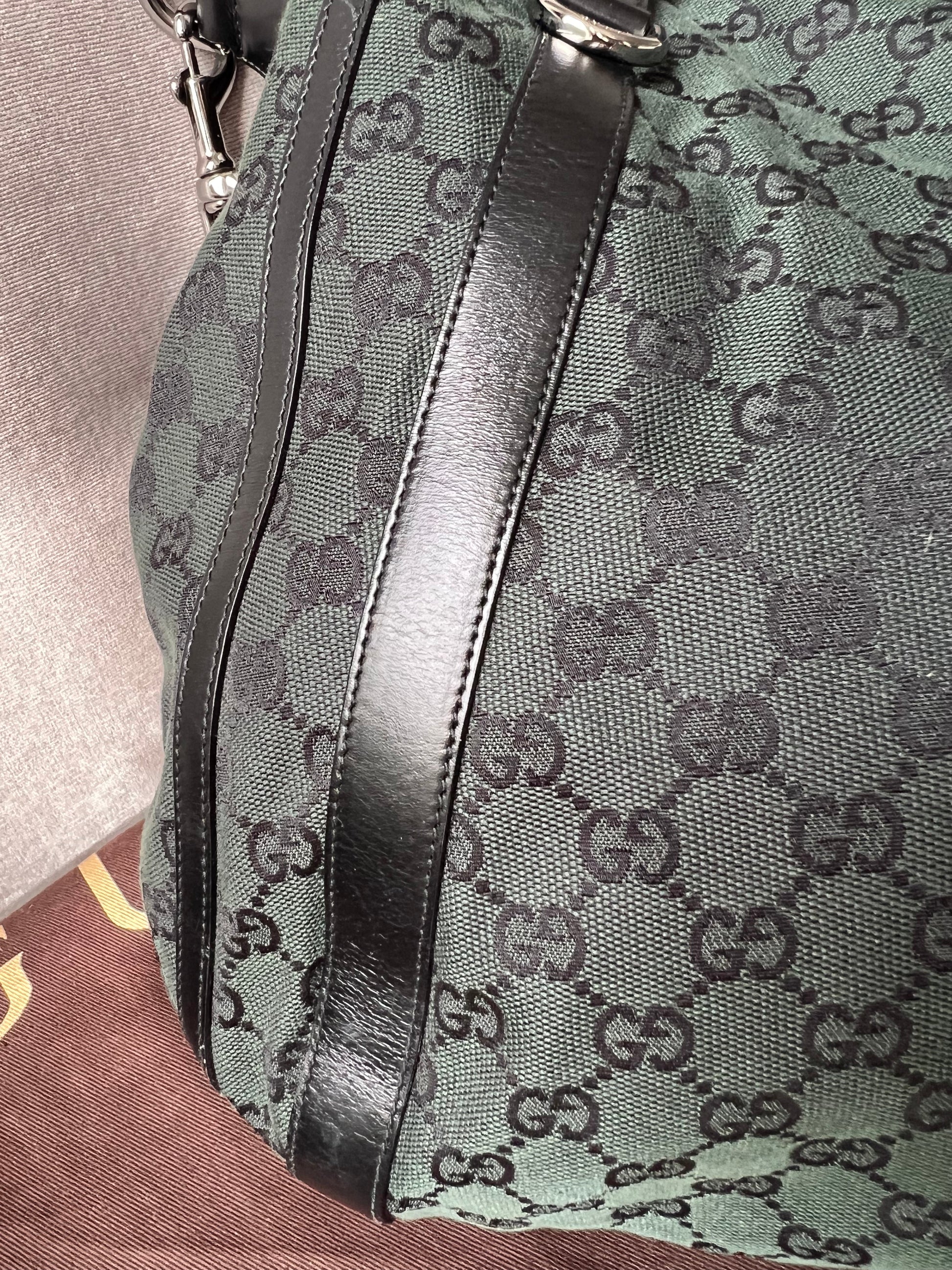 Gucci Vintage GG Tote in Dark Green Monogram Canvas with black leather trim with pale gold hardware. This medium to large, light and practical tote is an ideal bag for day to day use. A simple, open top with magnetic closure with two short top handles and a detachable longer handle. Can be carried by hand, over shoulder or in the crook of the arm.