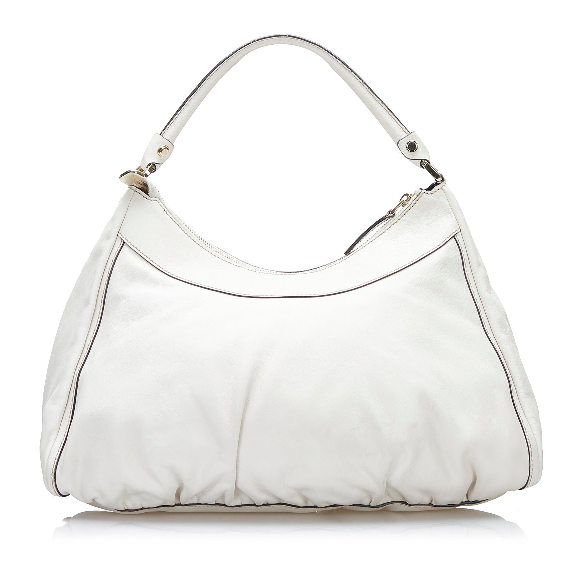 The Abbey shoulder bag features a leather body, rolled leather handles, a top zip closure, and an interior zip pocket.