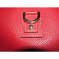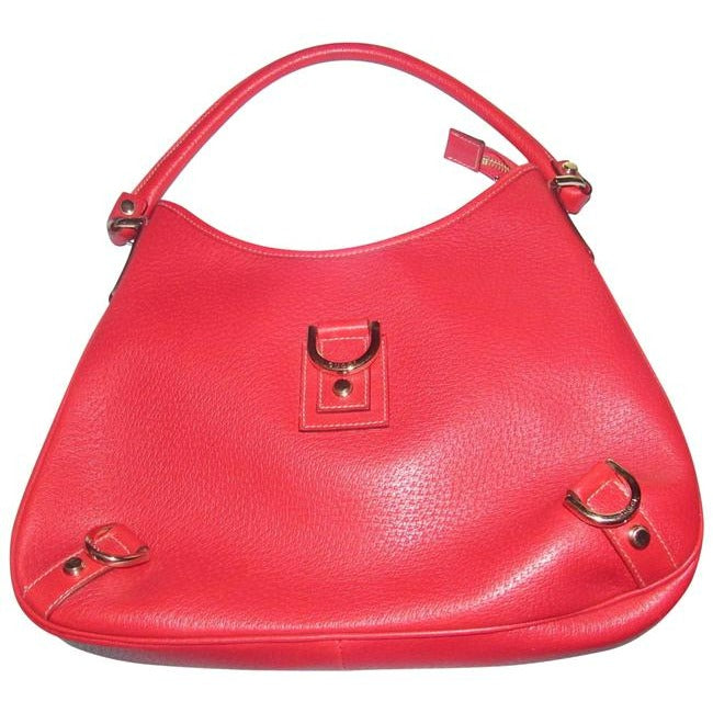 The bag is a true red textured leather, hobo style, top zip, shoulder purse with bold gold, 'd-ring' accents. It has a wider bottom and longer center and is a classic triangular, shape.