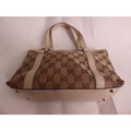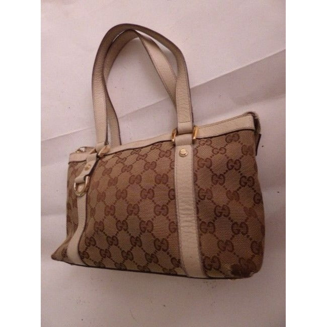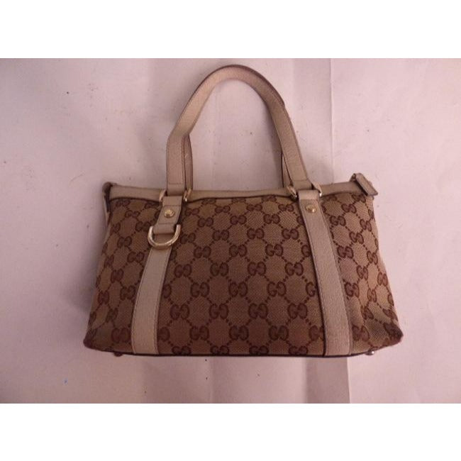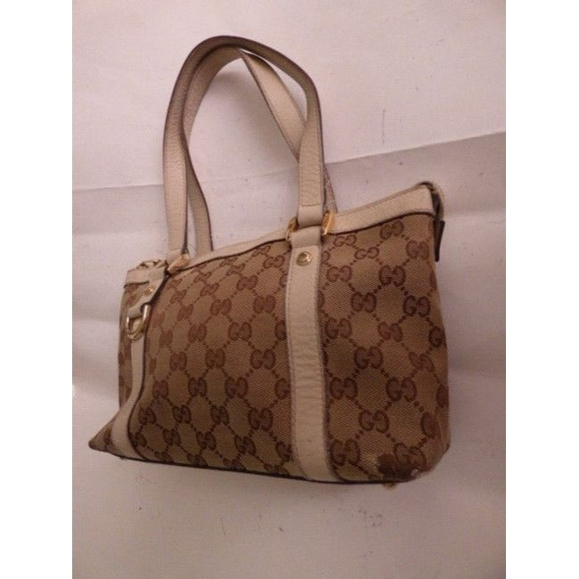 For sale is an authentic, Gucci, brown large G logo canvas and white leather, two handle, top zip, satchel style purse with gold tone horse-bit accents from the Abbey D ring line! This is a great looking piece from Gucci with a timeless style!