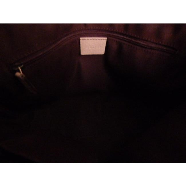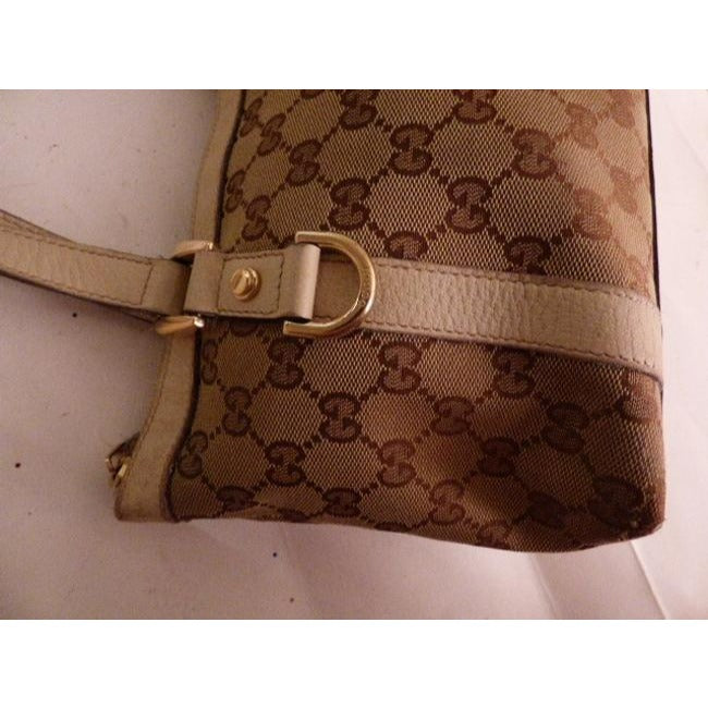 The purse is a zip top, satchel or tote style shoulder or handheld bag. The body of the purse is fabric in the large G logo style fabric in brown. It has white leather accents at the top, straps, and footed leather bottom. It has bold gold 'Abbey D 'ring' horse-bit, equestrian accents in the center engraved 'Gucci! It is a gorgeous purse with lots of room, perfect for an everyday signature piece! It is timeless and would work with any outfit!