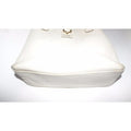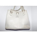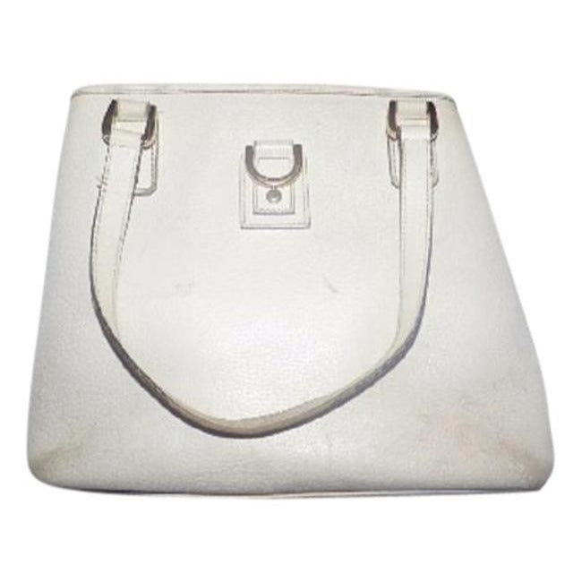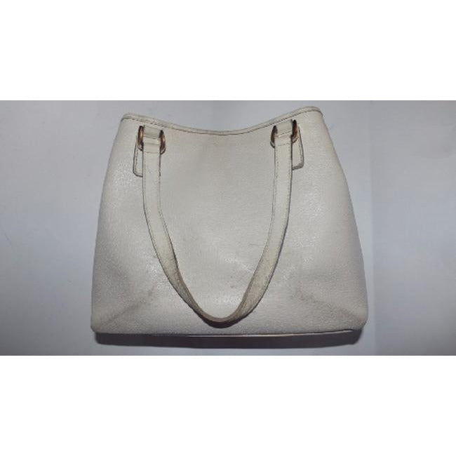 The bag is a satchel style purse with two straps. It has one interior compartment with smaller, interior pockets. This purse is called an 'Abbey large D ring' style! The purse is made of white, supple leather with od accents throughout.