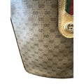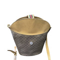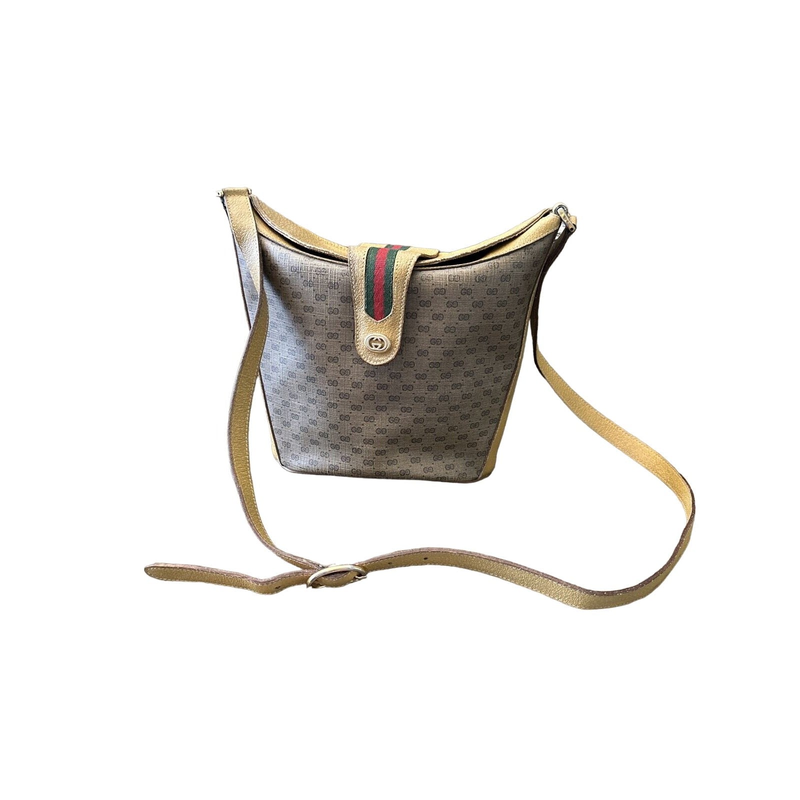 * For sale is a Gucci, RARE, brown micro Guccissima print coated canvas and leather, satchel/bucket style cross body/shoulder bag with a red and green Sherry striped, bold gold, top strap snap, gold hardware, and an iconic Gucci look! It is a rare style and color that would be great used as your signature brown purse!