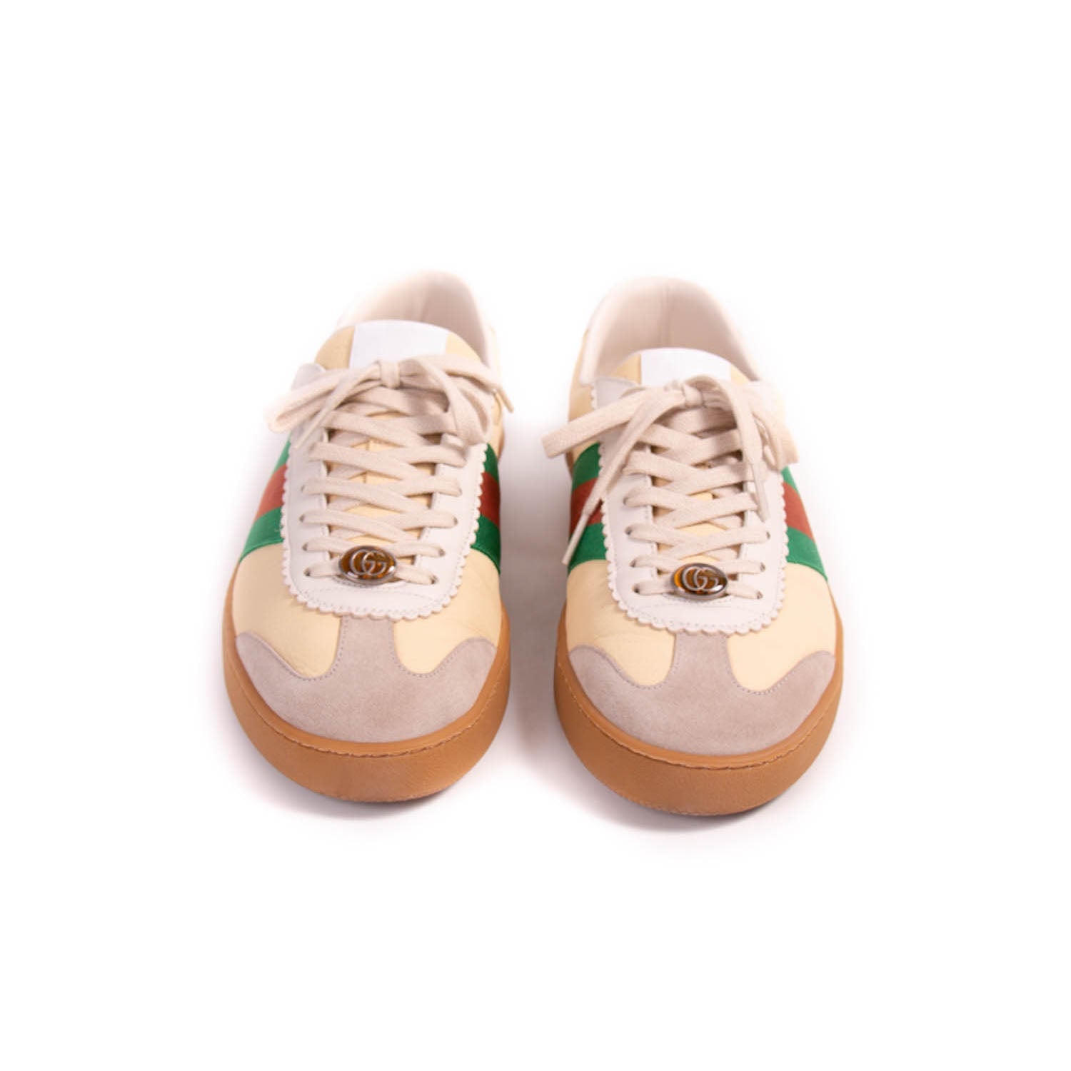 Details: Beige Leather and Canvas / Green and Red Web / Logo Embellishment at Front Lace / Bee Embossed at Sole