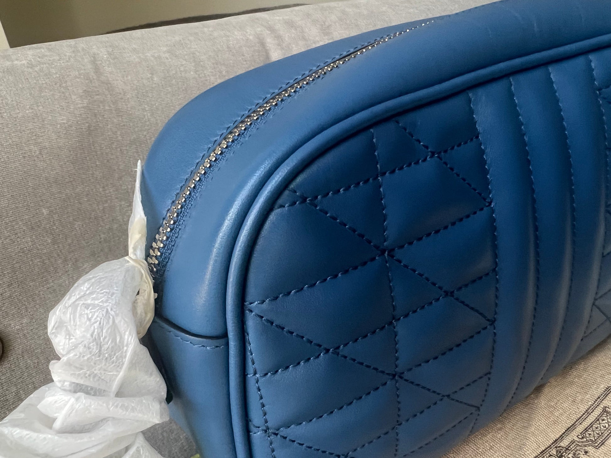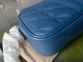 Gucci GG Marmont small shoulder bag in blue chevron matelassé leather with antique silver hardware. For the Gucci Aria collection, the small marmont style is reimagined with a new geometric approach to the signature material. It has a softly structured shape and zip top closure. Effortlessly chic and sophisticated, this style can be both with a casual outfit or for evening wear. Suitable for both day to day or occasion wear and ideal for those who prefer a cross body option. Note image 2 shows black version for size reference.