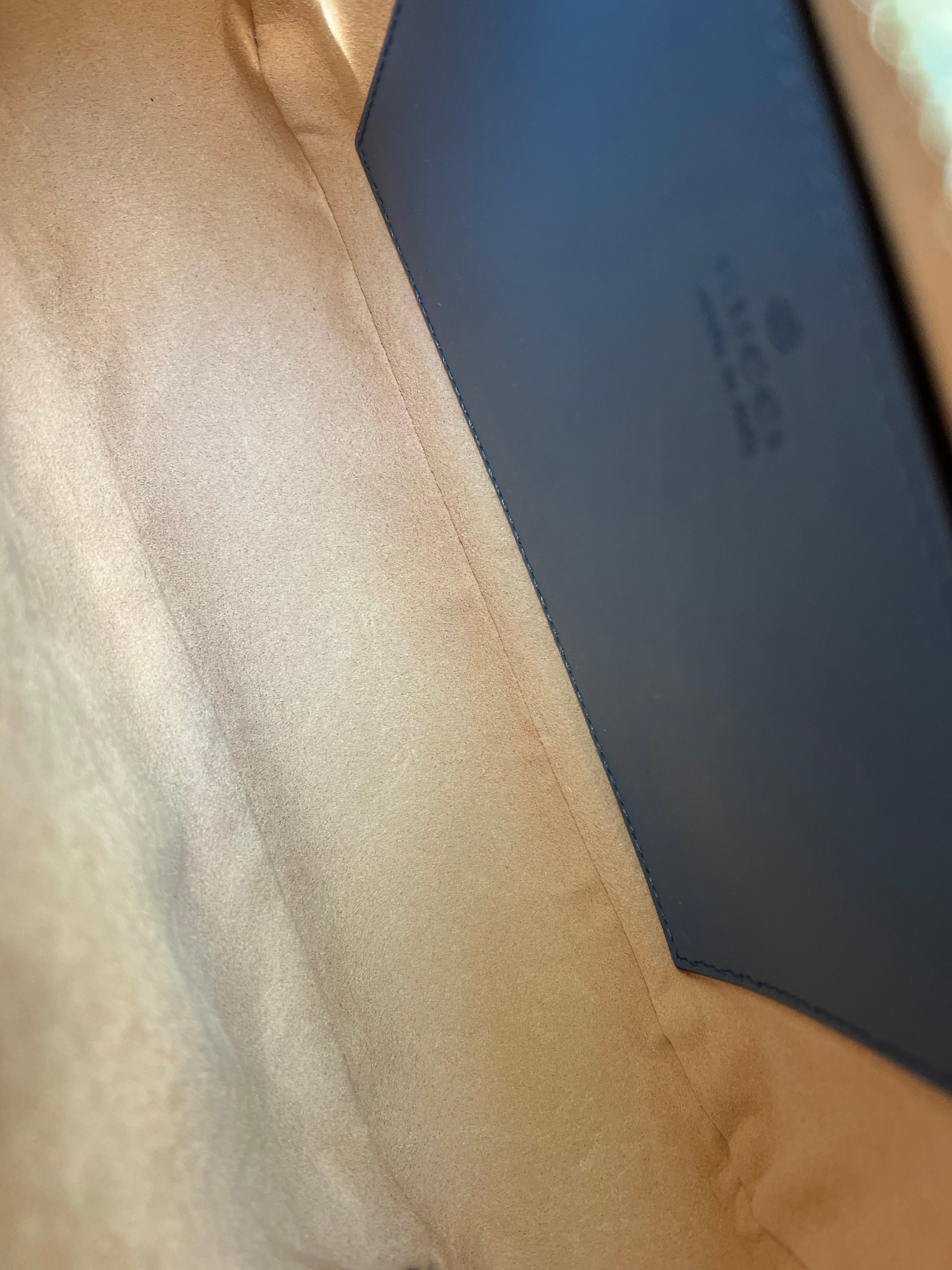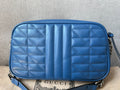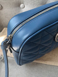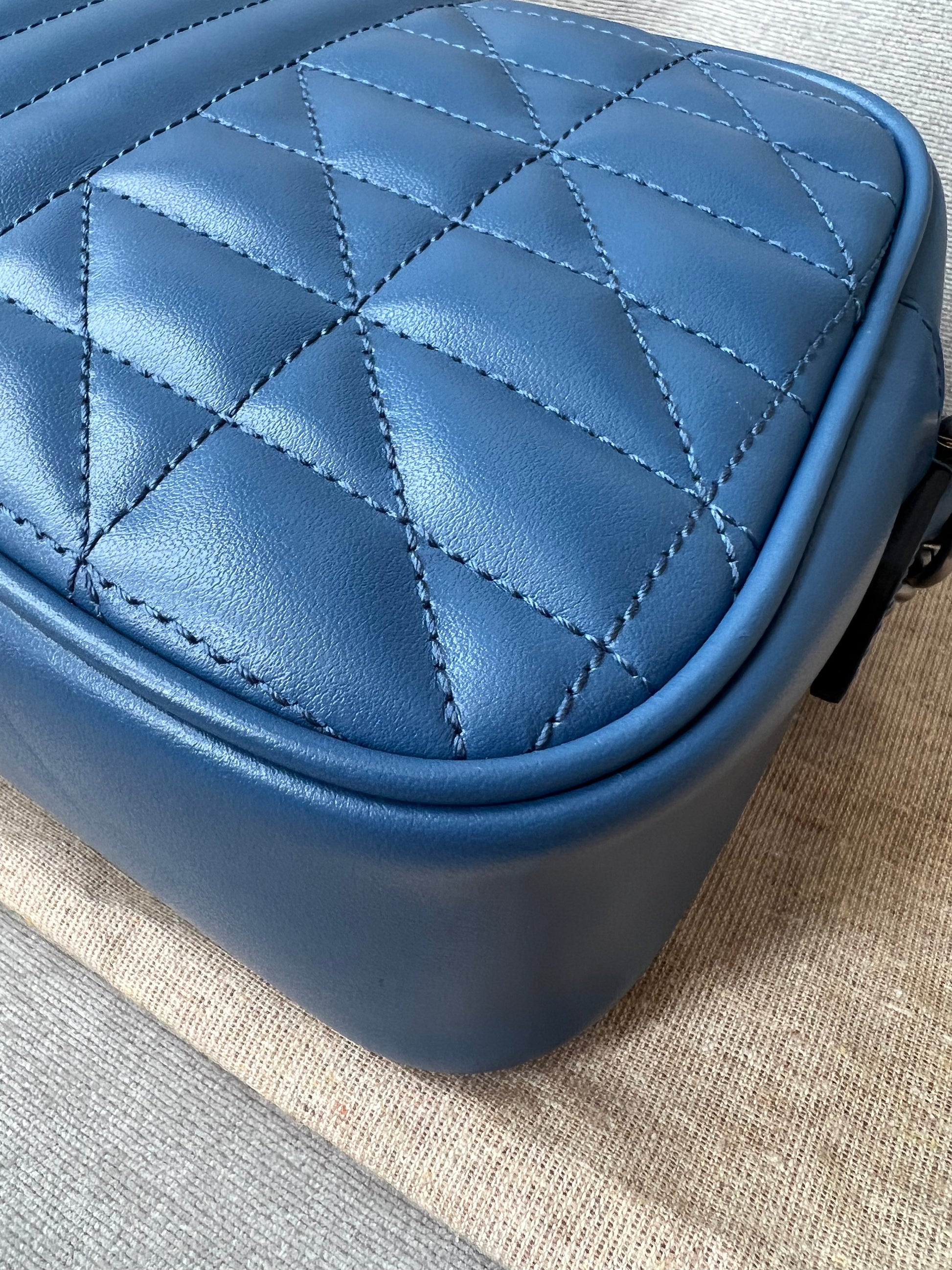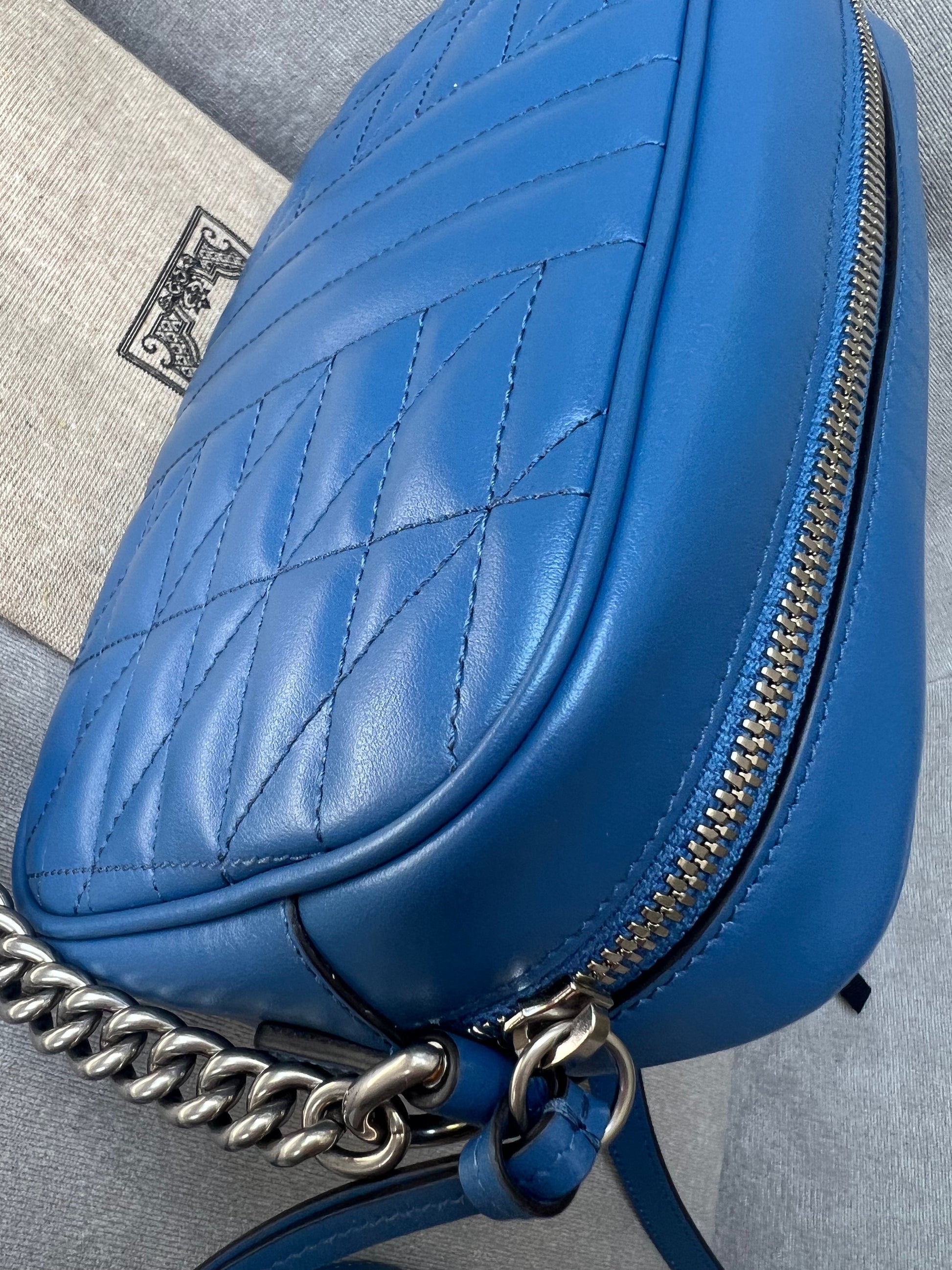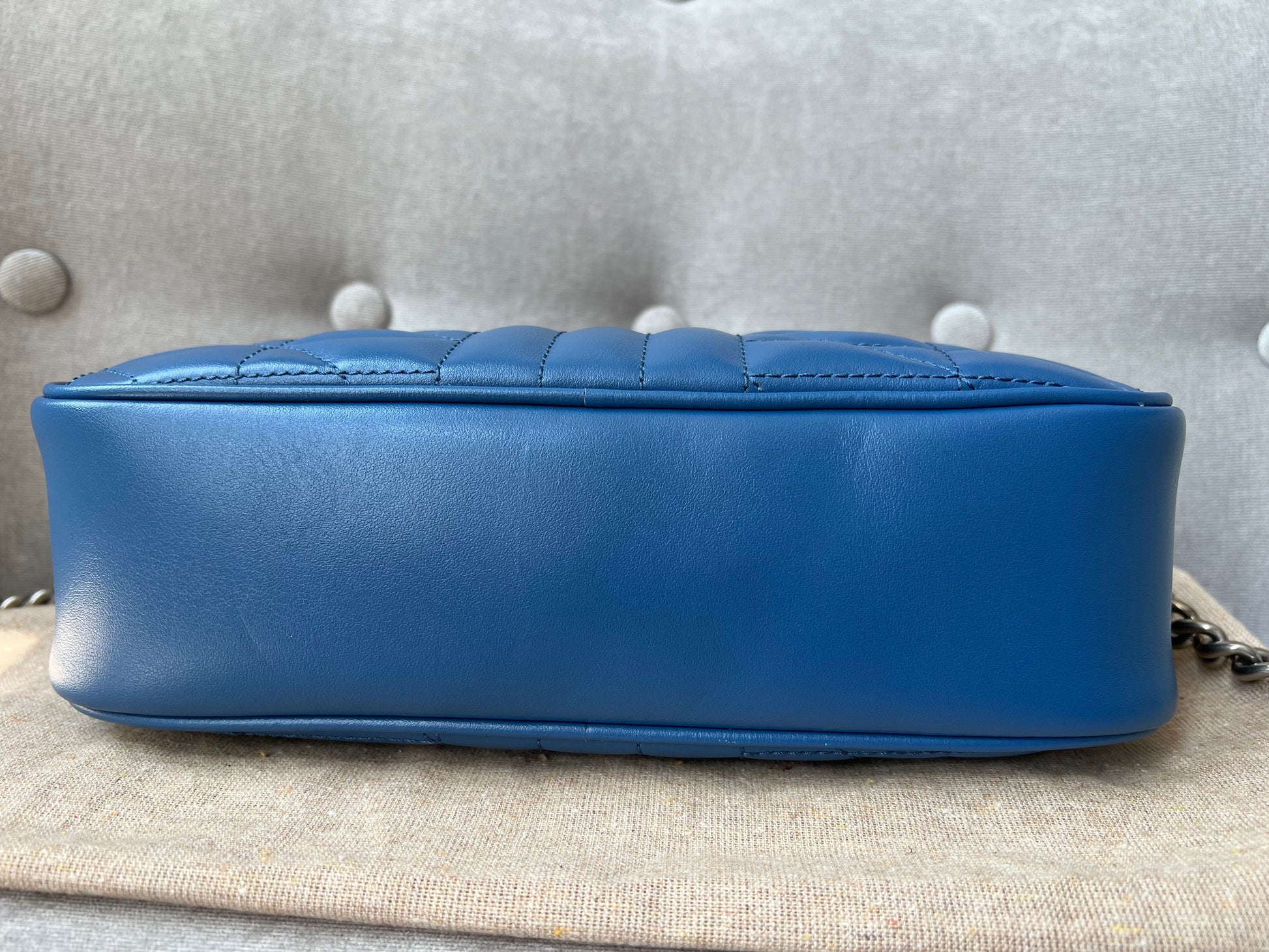 Gucci GG Marmont small shoulder bag in blue chevron matelassé leather with antique silver hardware. For the Gucci Aria collection, the small marmont style is reimagined with a new geometric approach to the signature material. It has a softly structured shape and zip top closure. Effortlessly chic and sophisticated, this style can be both with a casual outfit or for evening wear. Suitable for both day to day or occasion wear and ideal for those who prefer a cross body option. Note image 2 shows black version for size reference.