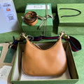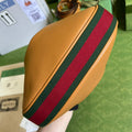An ode to the timeless Hollywood glamour that shaped Gucci Love Parade, classic elements from the House's archives are reintroduced. Distinguished by its crescent moon shape, the accessory is further defined by a G shaped hook closure. Paired with soft materials, the heritage hardware creates a refined design with vintage appeal. This large version is crafted in dark orange leather with green and red Web trim.