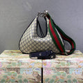 An ode to the timeless Hollywood glamour that shaped Gucci Love Parade, classic elements from the House's archives are reintroduced. Distinguished by its crescent moon shape, this small shoulder bag further defined by a G shaped hook closure. Paired with soft materials, the heritage hardware creates a refined design with vintage appeal. GG Supreme canvas in beige and blue accentuate the logo feel.