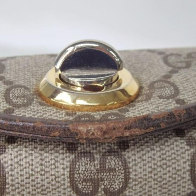 The bag is a shoulder style purse by GUCCI in a rare, large G logo print coated canvas and leather style. It has gold tone hardware and has a twist type of top closure. There are bold, polished gold, accents on the sides and at the front exterior of the snap closure. Inside, it has three layers of compartments to allow it to hold more than you may think. The tan leather lined interior has lots of slit and zip pockets and three compartments to keep you organized and is very clean.