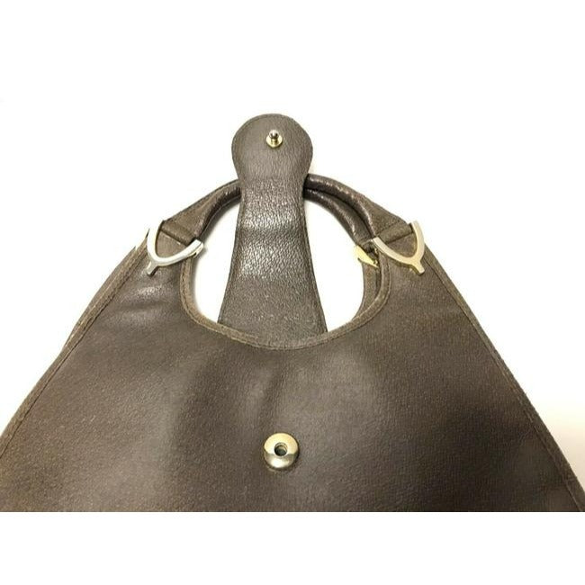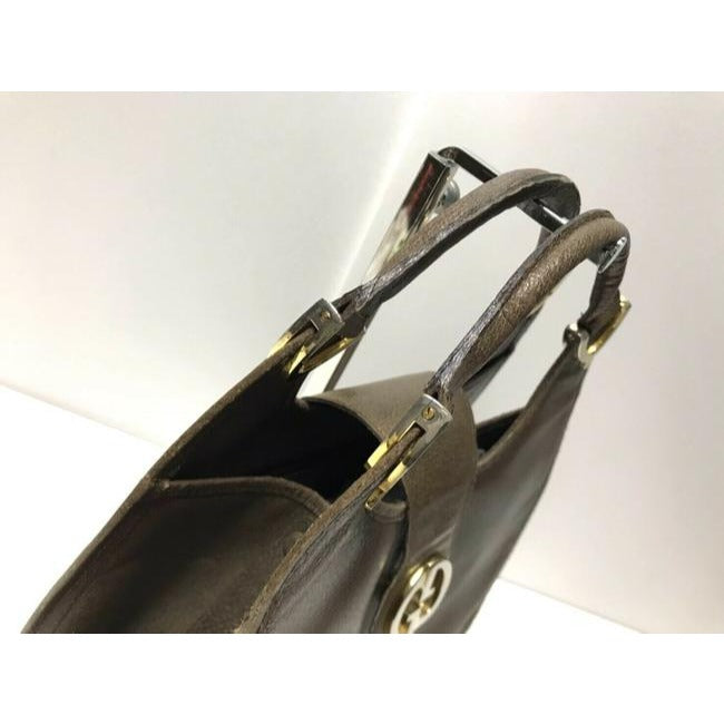 The bag is unusual- not like the usual Gucci, purses you will find for sale online. The top handle satchel style shoulder purse is a unique, graduated, domed shape and is made of a buttery soft, brown leather. It has a bold gold double GG accent on the flap snap closure in the 1973 logo style. The wide flap closure matches the brown leather throughout and the hardware is a polished gold color. It has a structured shape and lots of room!