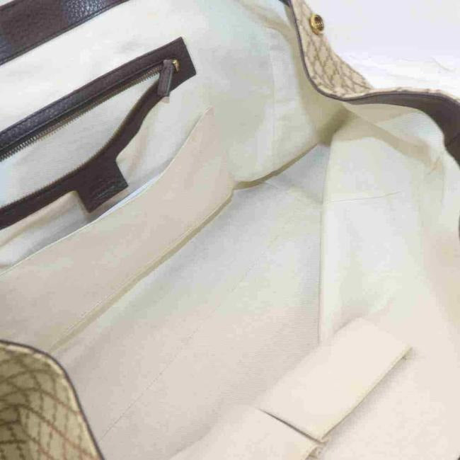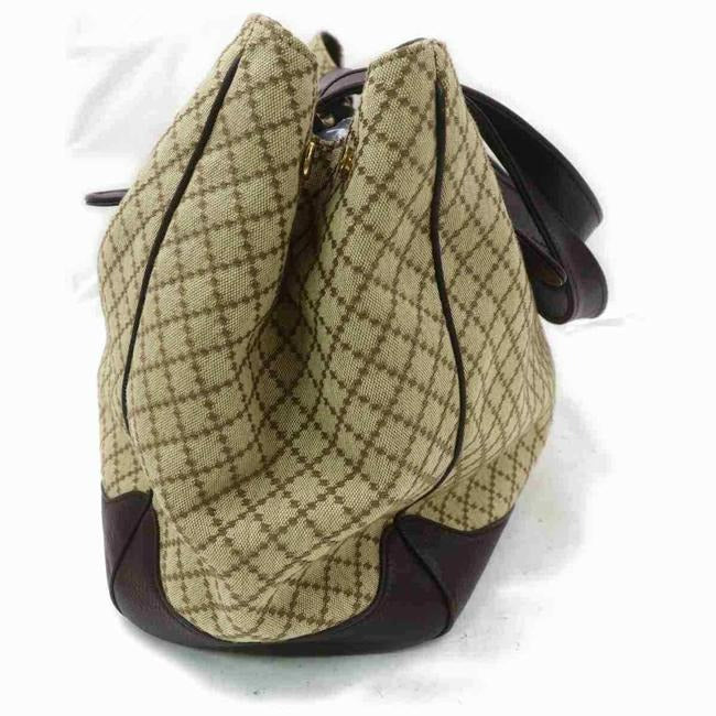 For sale is a unique, Gucci, brown on tan diamante print canvas and brown leather, XL '1973' top handle shoulder bag with a bold gold GG accent on the flap snap closure, a footed bottom, equestrian details, and lots of room! It is a unique style that Gucci re-released - it would be a great used as your signature brown purse!