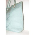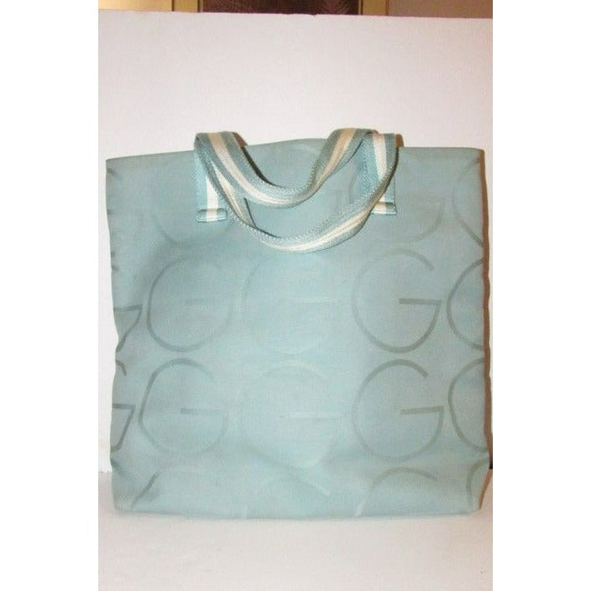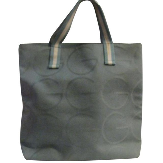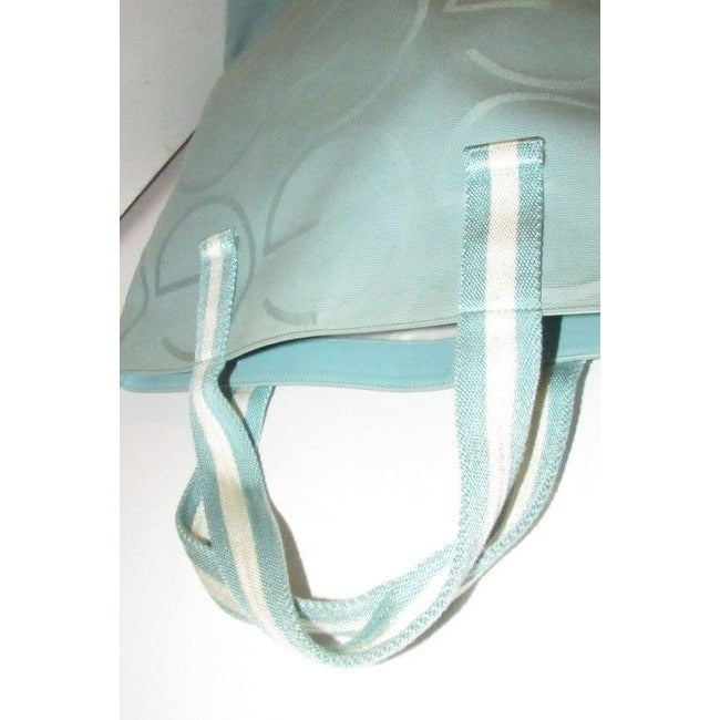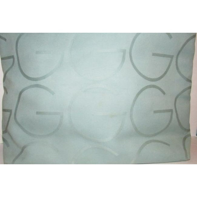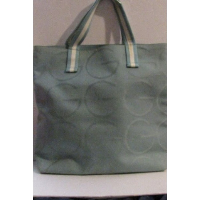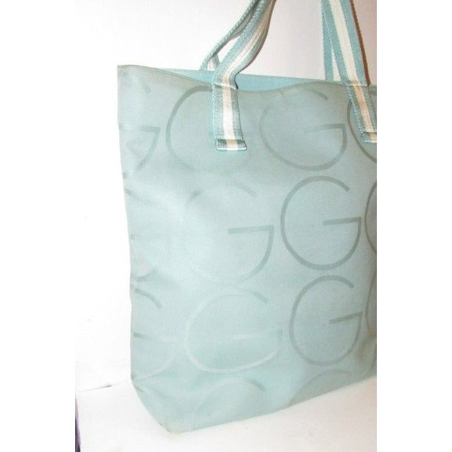 The bag is a two handle, extra large tote style purse by GUCCI. It is made from teal green heavy, jacquard canvas with the extra large Guccissima print and matching leather. It has an open top without a closure and two, blue and white Sherry striped fabric handles. The exterior has no wear other then maybe some dust from storage- see pictures.