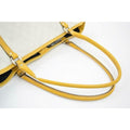 The bag is a two handle, tote or satchel style purse by GUCCI. It is made from brown large G logo print on white coated canvas and yellow leather. It has a snap top closure with two, heavy rolled leather handles and yellow leather accents around the top of the tote. Attaching the handles are chrome rings attached to leather bands that go around the purse. The exterior of the purse is in excellent overall condition!
