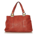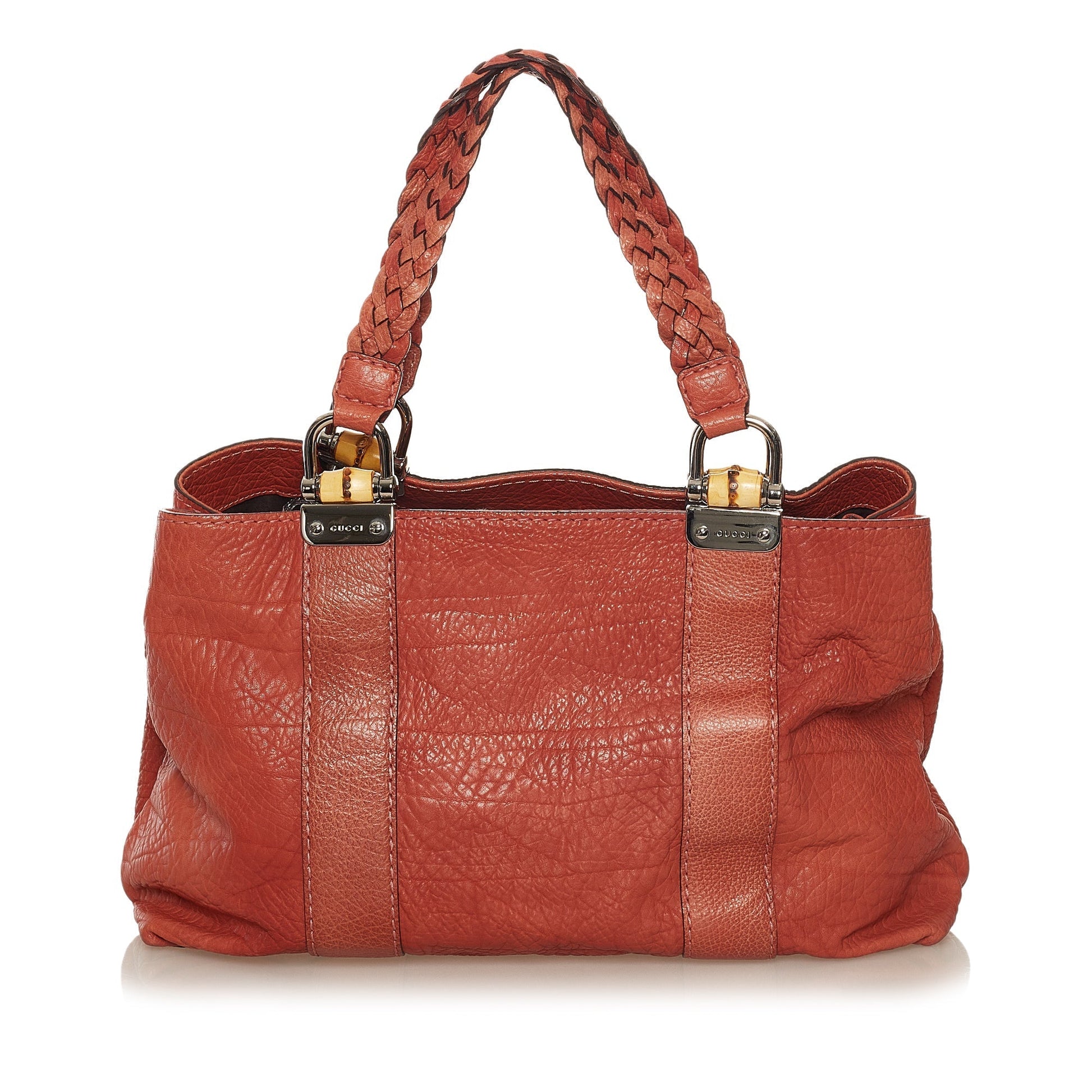 This Gucci Bamboo Bar Bag is made of red leather. It features flat braided straps and an open top. The interior offers the Bag one zippered compartment and open slip pockets.