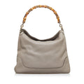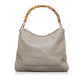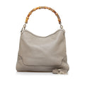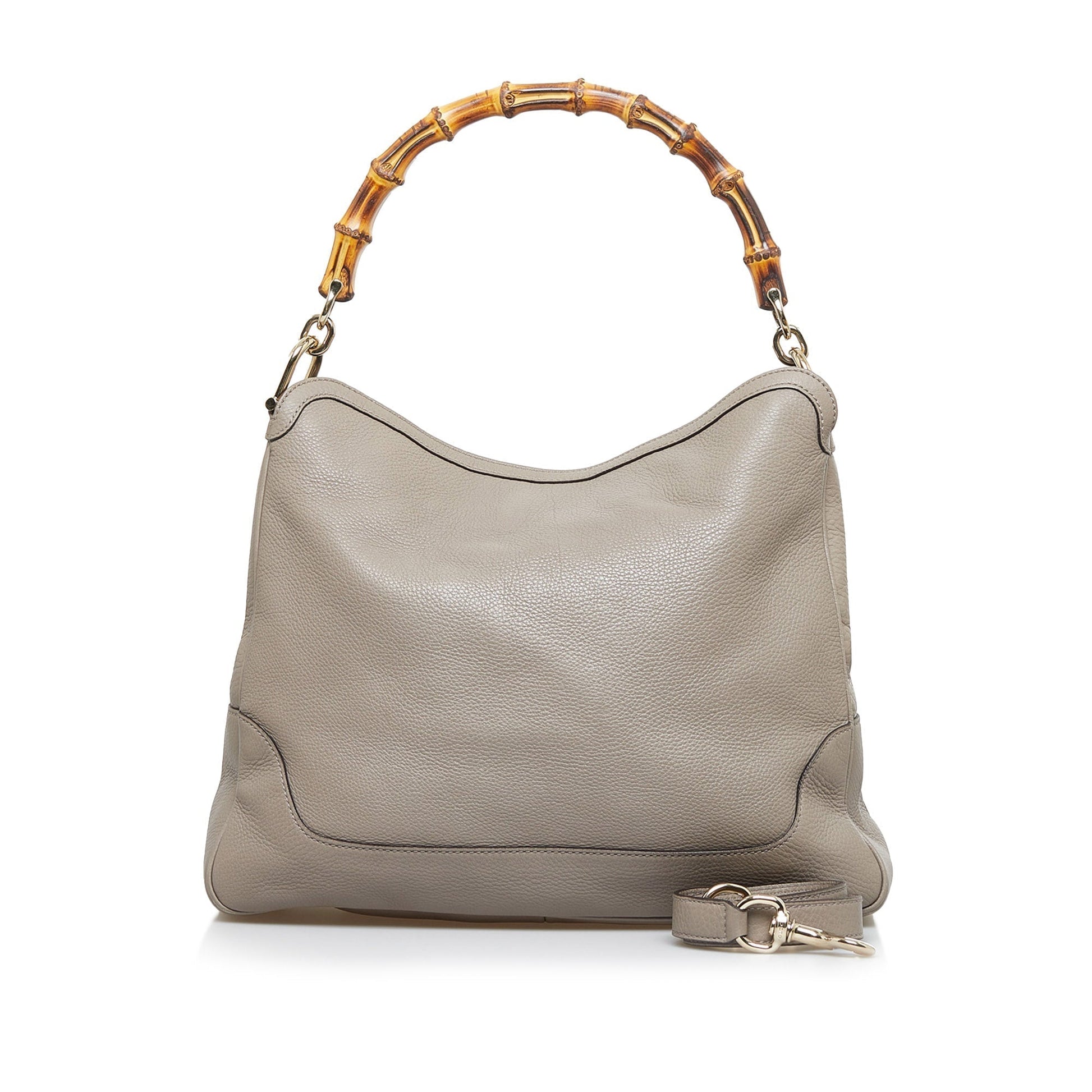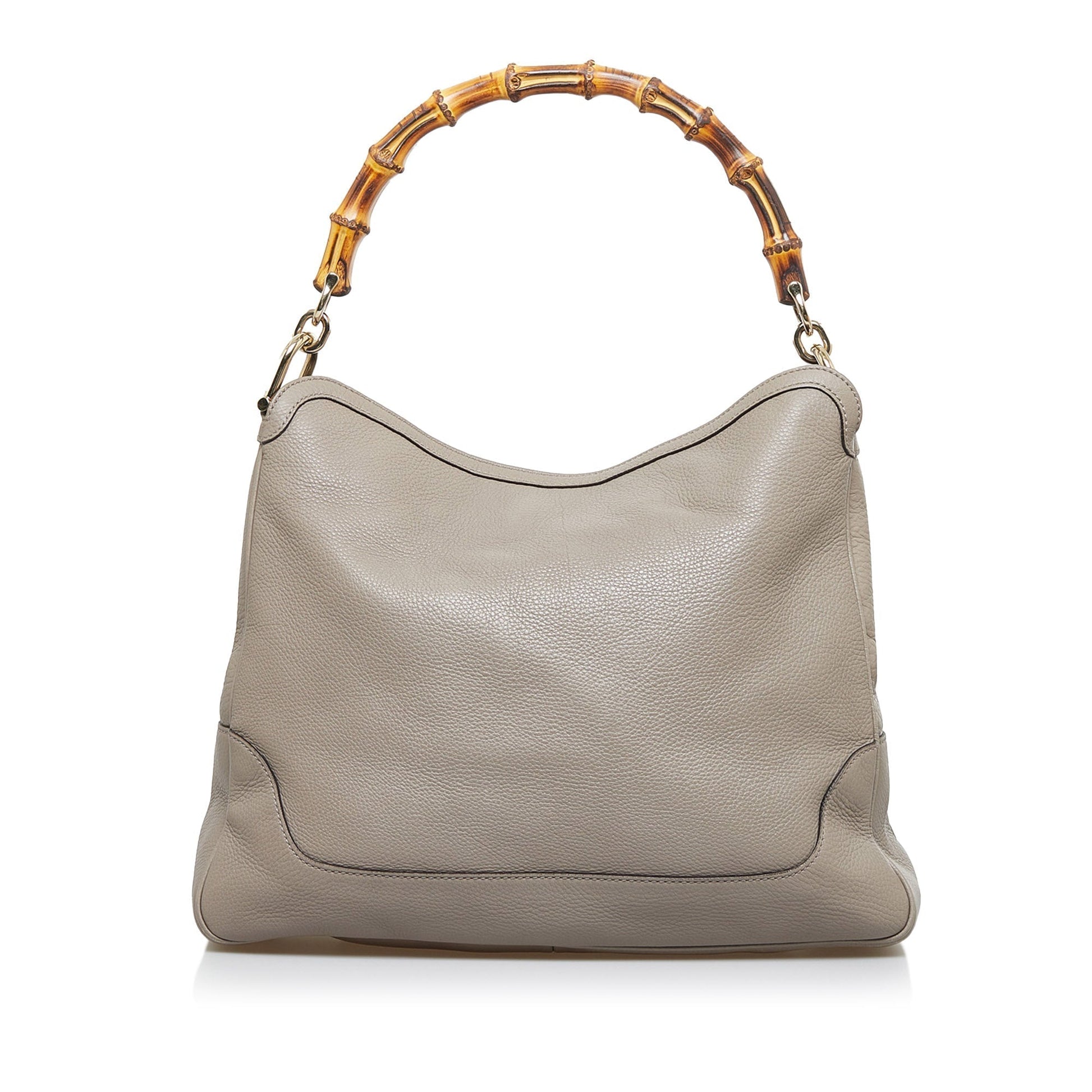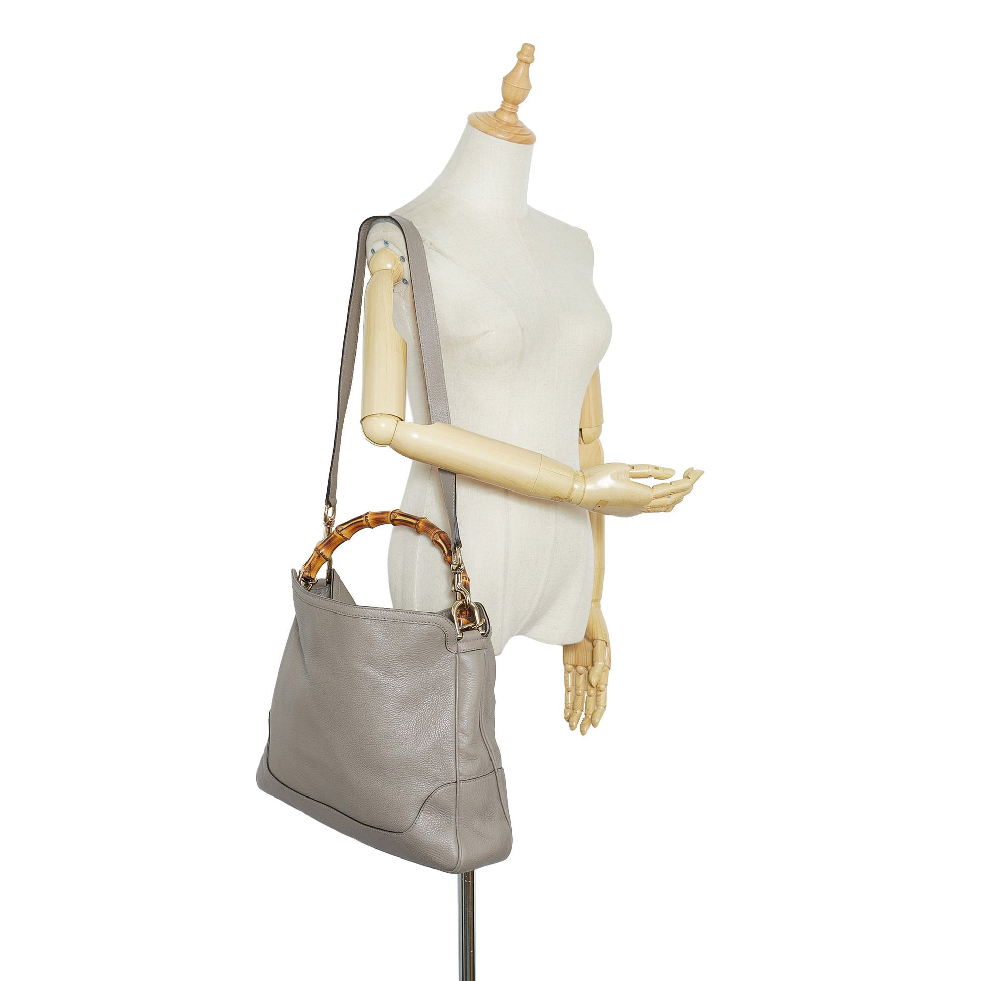 The Bamboo Diana features a leather body, a bamboo handle, a detachable strap, an open top, and interior zip and slip pockets.